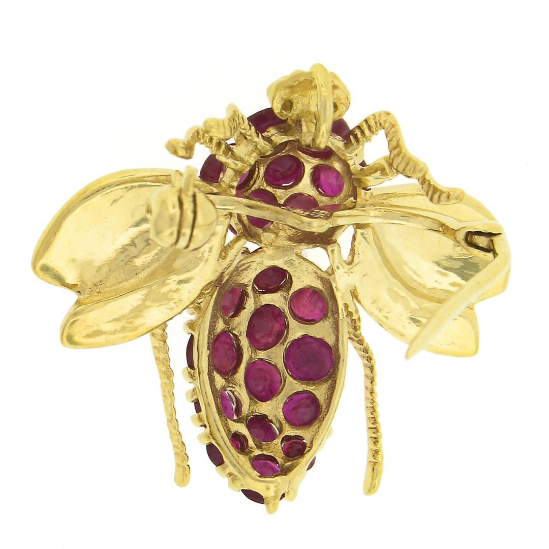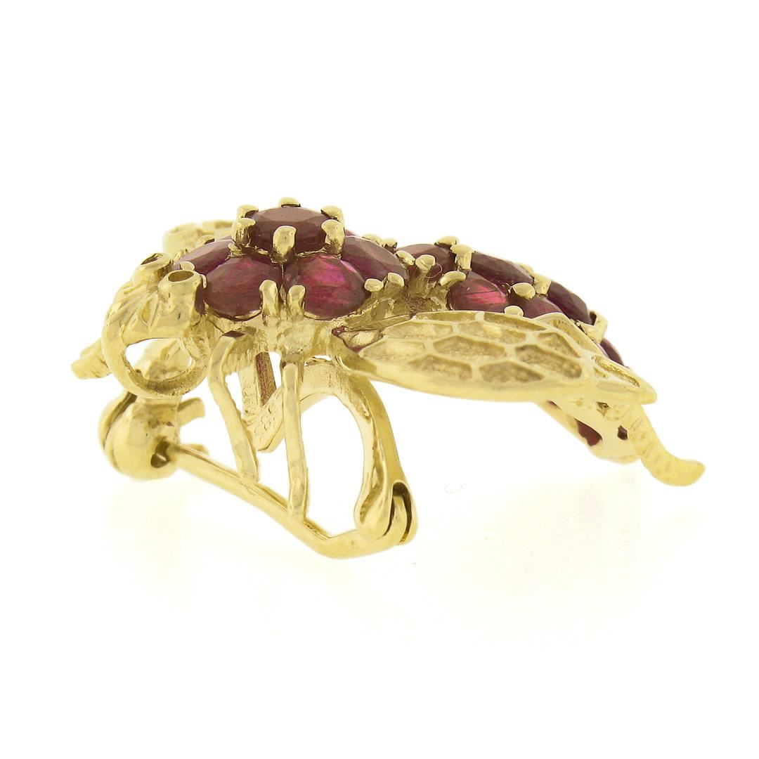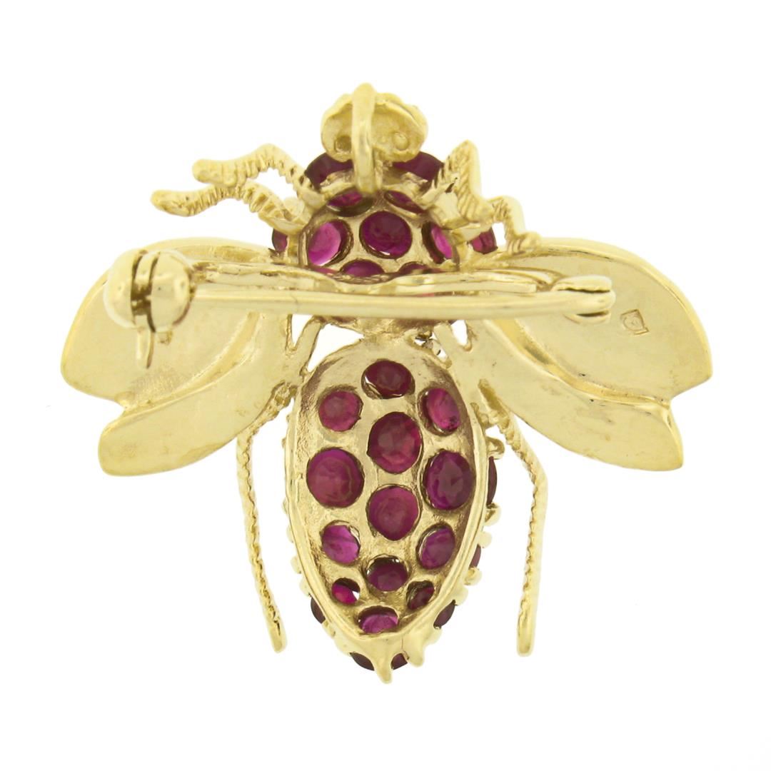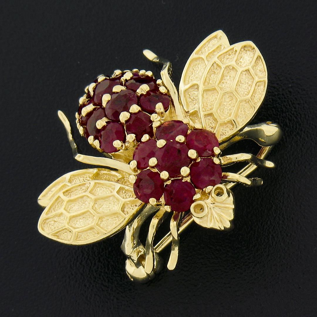 A solid 14k yellow gold bee brooch, with 20 round cut natural rubies (1.40ctw). Measures 24.9x27.3mm and weighs a total of 5.29 grams.