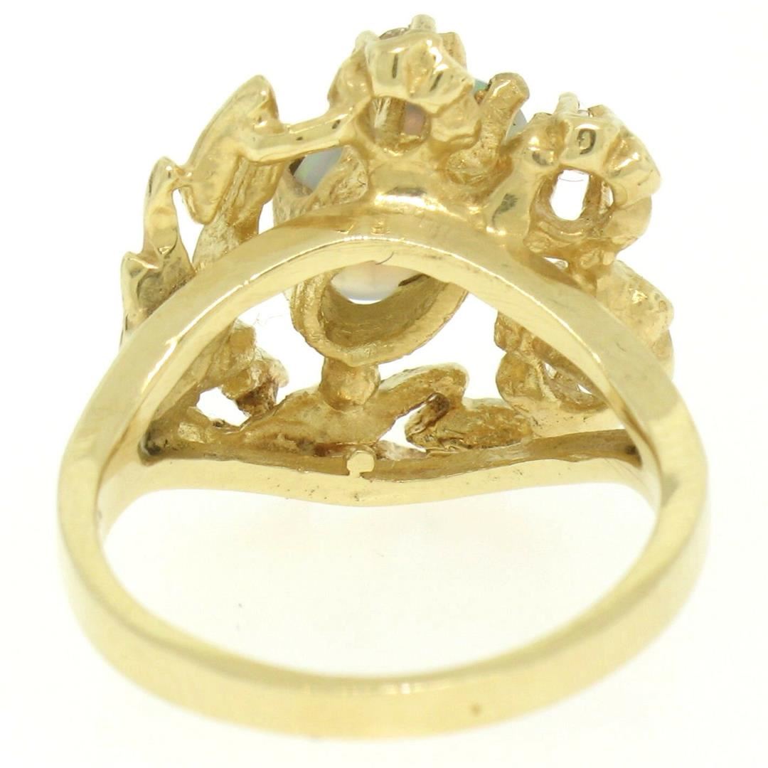 One Vintage 14K Yellow Gold 1.59ctw Cabochon Opal & Diamond Textured Cocktail Ring. Item Details - Material: 14K Yellow Gold, Weight: 5.0 Grams, Stone(s): (1) Natural Genuine Opal - Cabochon Cut - Prong Set - Green with Purple Accents Color - 8x6mm / 1.5ct (approx.), (3) Natural Genuine Diamonds - Round Brilliant Cut - Prong Set - F Color - VS1 Clarity - 0.09ctw (approx.), Total Carat Weight: 1.59 (approx.), Ring Size: 4.5, Ring Width: 16.36mm, Ring Height: 8.92mm rise off the finger, Condition: Vintage piece. Excellent, ready to wear condition!