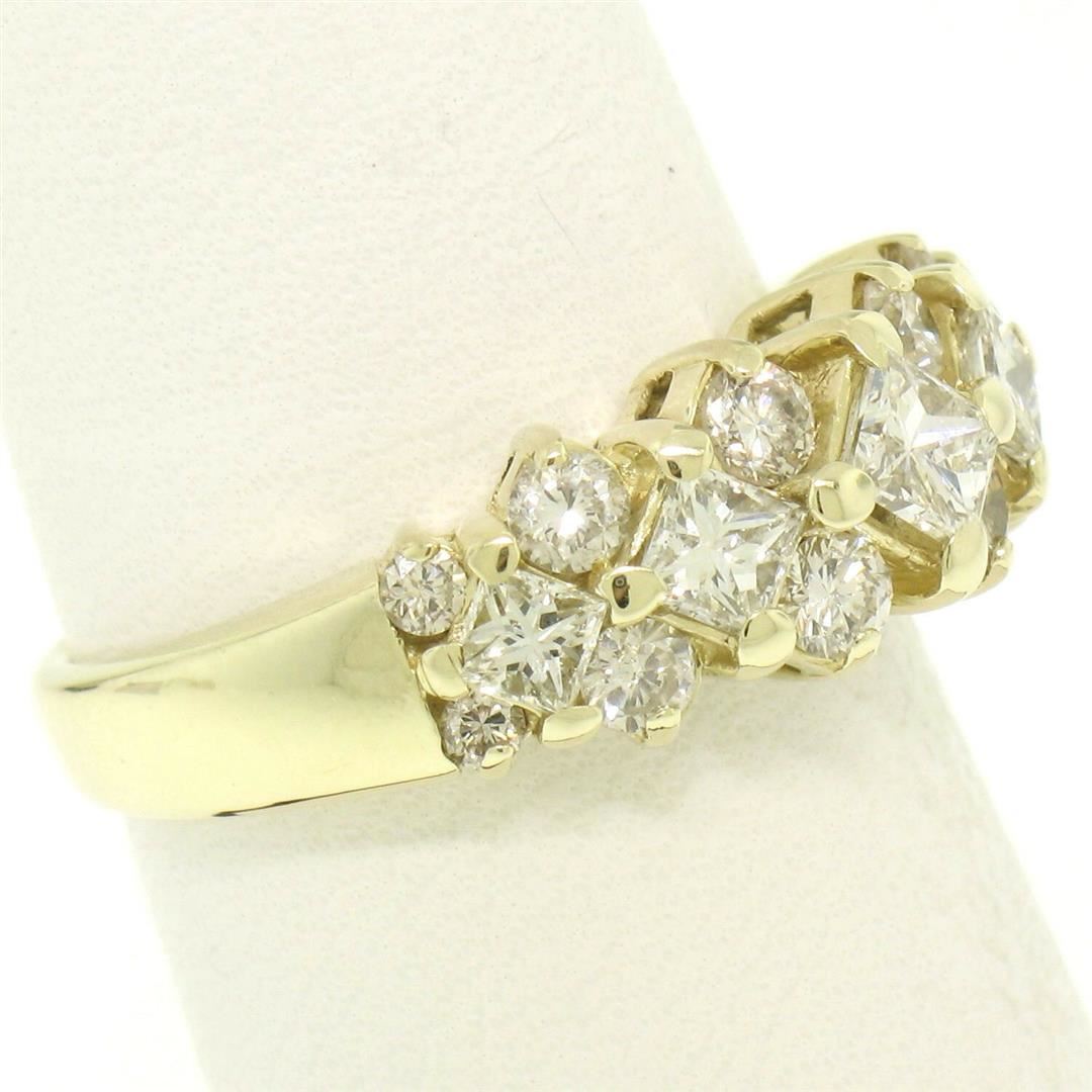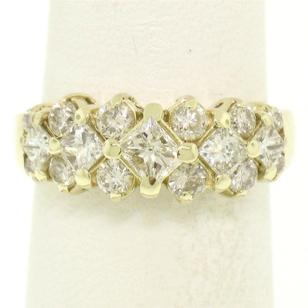 One 14K Yellow Gold 1.80ctw H VS Princess & Round Cut Diamond Cluster Wide Band Ring. Item Details: Material: 14K Solid Yellow Gold, Weight: 5.2 Grams, Stone(s): (5) Natural Genuine Diamonds - Princess Cut - Prong Set - H/I Color - VS1-2 Clarity - 0.95ctw (approx.), (12) Natural Genuine Diamonds - Round Cut - Prong Set - H/I Color - VS1-2 Clarity - 0.85ctw (approx.), Total Carat Weight: 1.80 (approx.), Ring Size: 6.5 (We can custom size this ring.), Ring Width: 7.7mm, Ring Height: 6.2mm rise off the finger Condition: Like New! Signature: MARS 14K