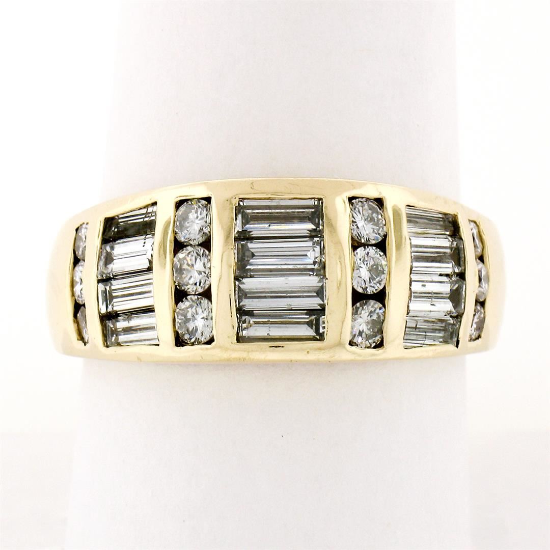 An estate solid 14k yellow gold wide band ring, featuring 12 round brilliant cut natural diamonds (G/H - VS2/SI1 ; 0.48ctw), and 12 baguette cut natural diamonds (G/H - VS2/SI1 ; 1.40ctw ). The ring is size 9.5, weighs a total of 7.58 grams, and measures 9.0mm wide.