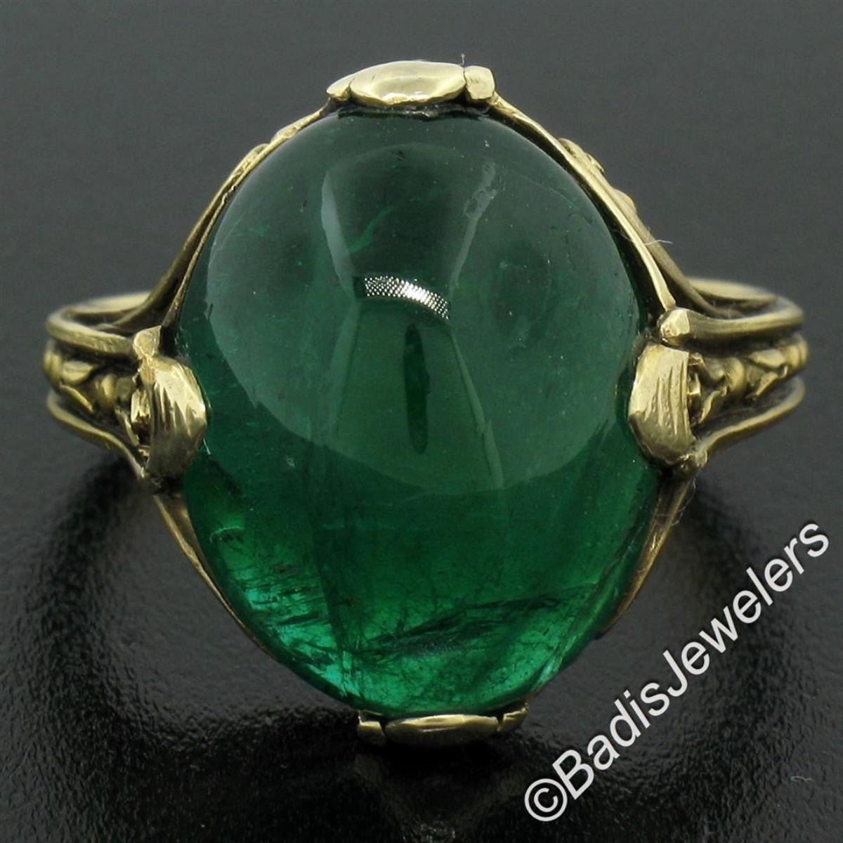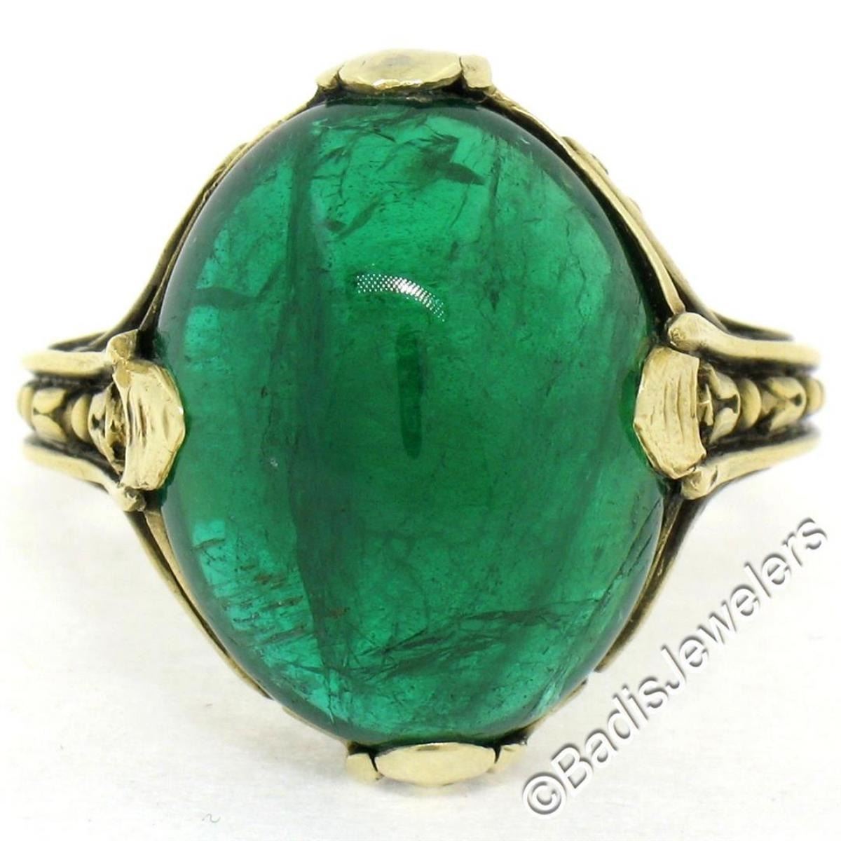 One Antique Etched 14K Yellow Gold 10.03ct GIA Oval Cabochon Zambian Emerald Ring. Item Details: Material: Solid 14K Yellow Gold, Weight: 6.70 Grams, Stone(s): (1) Natural Genuine Emerald - Prong Set - 10.03ct (approx. - based on GIA measurements), Ring Size: 6.5 (We can custom size this ring), Ring Width: 17.65mm (top of the ring) - 2.40mm (bottom of the shank), Ring Height: 8.0mm rise off the finger, Condition: Antique ring w/ gorgeous patina. MINT, 100% ready to wear condition! Comes with original GIA certification for center stone!, Certification Details, Laboratory: GIA, Report Number: 6183143712, Stone Type: Natural Beryl - Emerald, Stone Shape: Oval, Cutting Style: Cabochon, Transparency: Transparent, Measurements: 15.24 x 12.27 x 7.17 mm, Geographic Origin: Zambia, Treatment: Clarity Enhanced