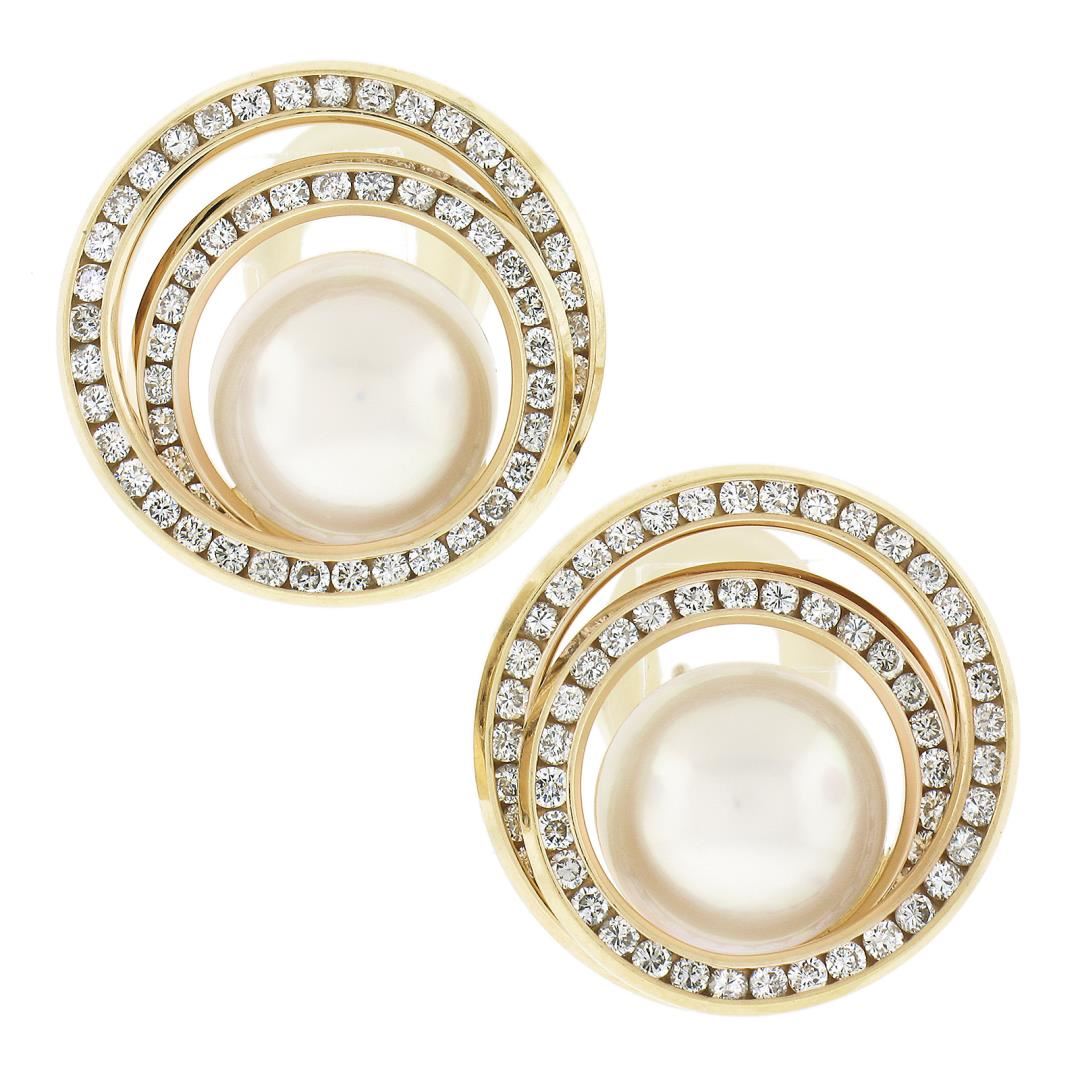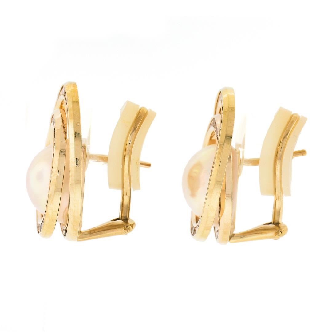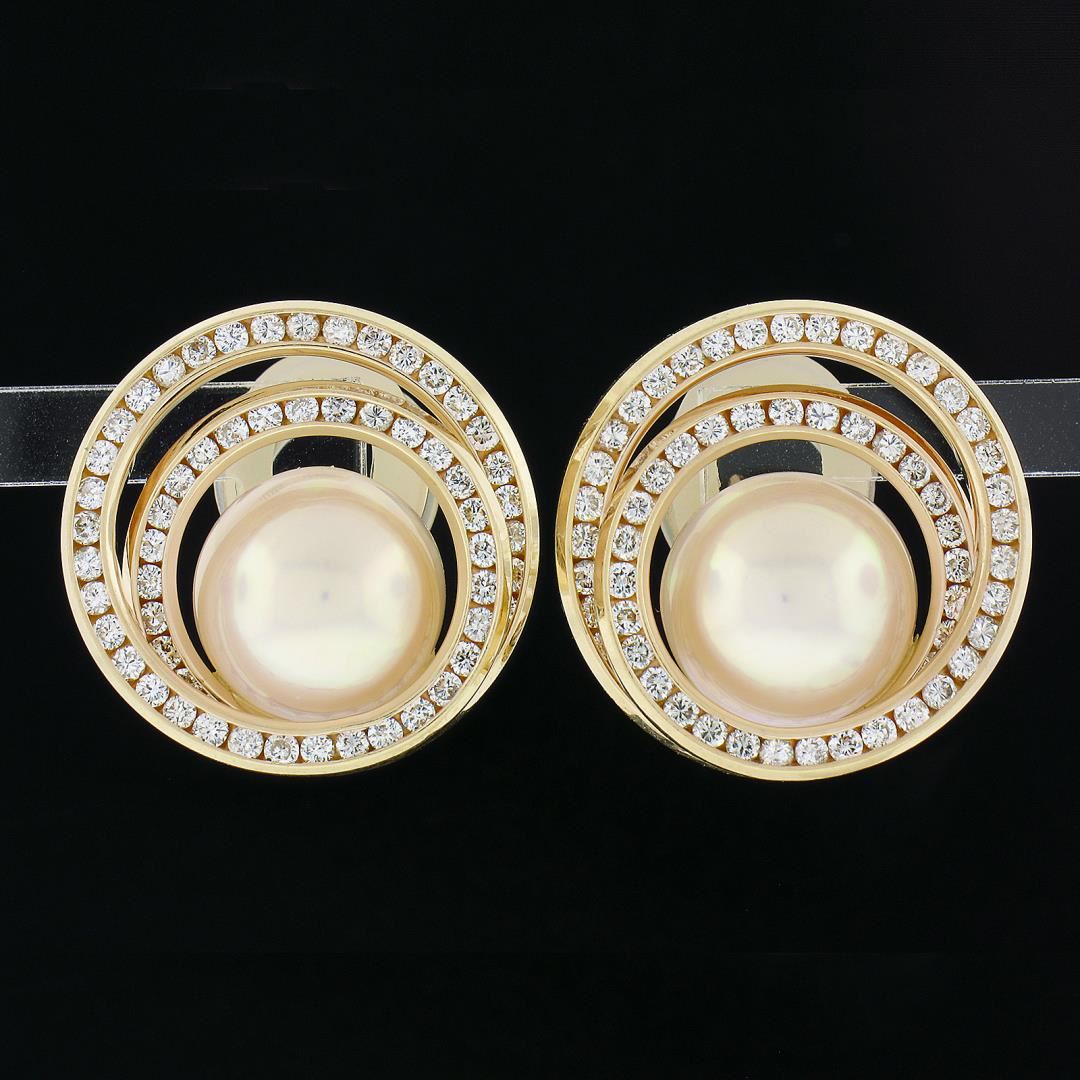 A solid 14k yellow gold button earrings, with 2 round shape cultured mabe pearls (11mm each), and 132 round brilliant cut natural diamonds (G/H - VS2/SI1 ; 1.75ctw). The earrings measure approximately 20.8x20.6mm and weigh a total of 11.28 grams.