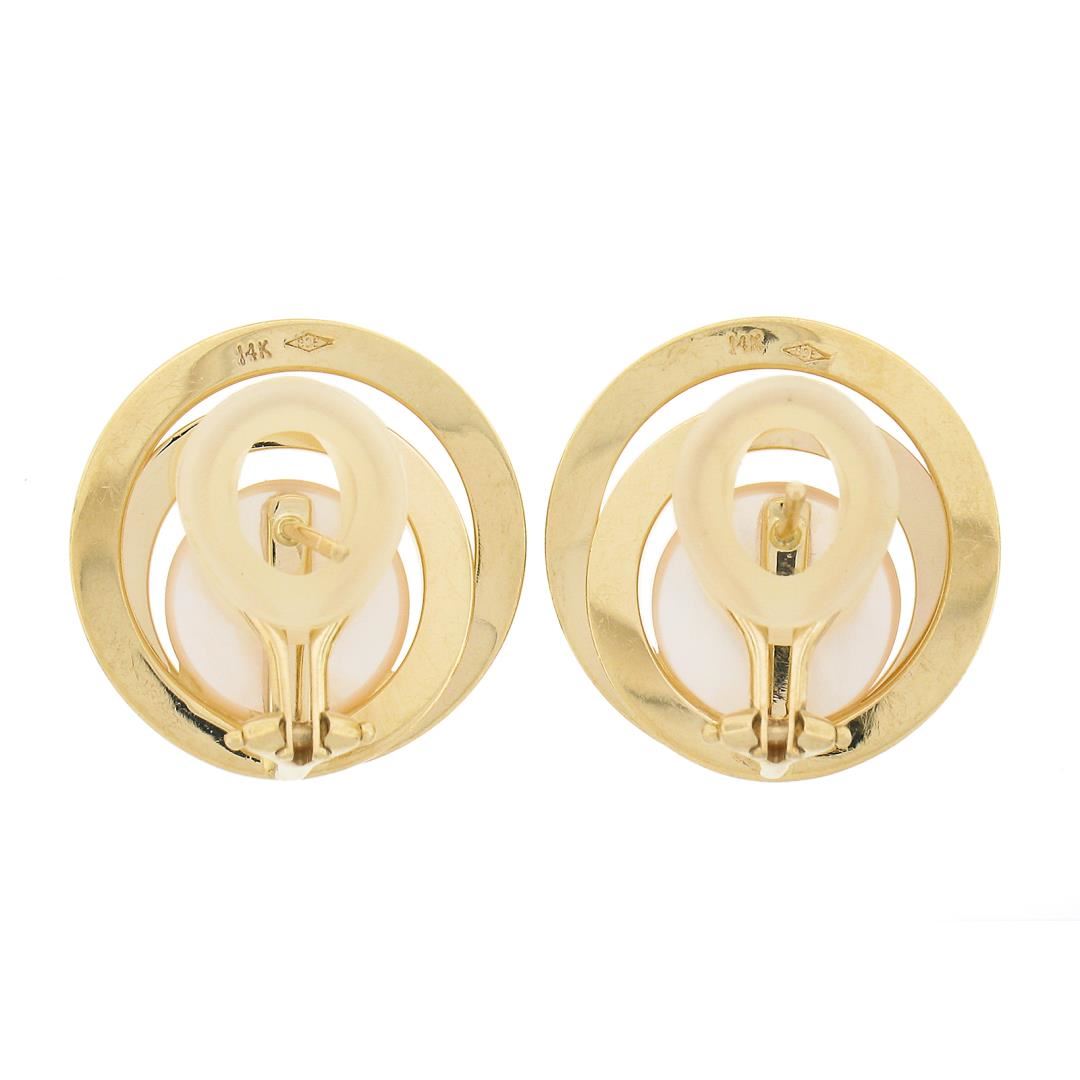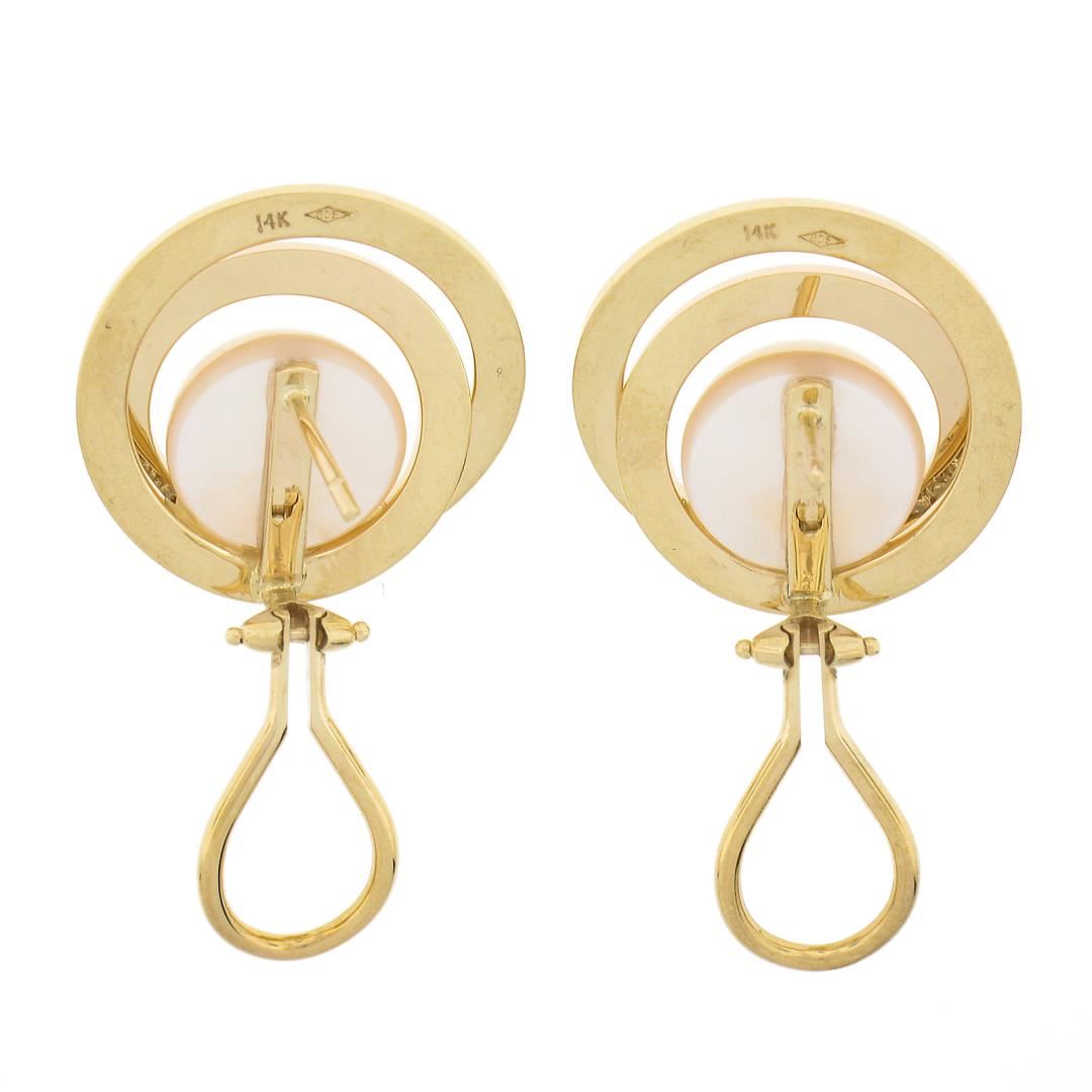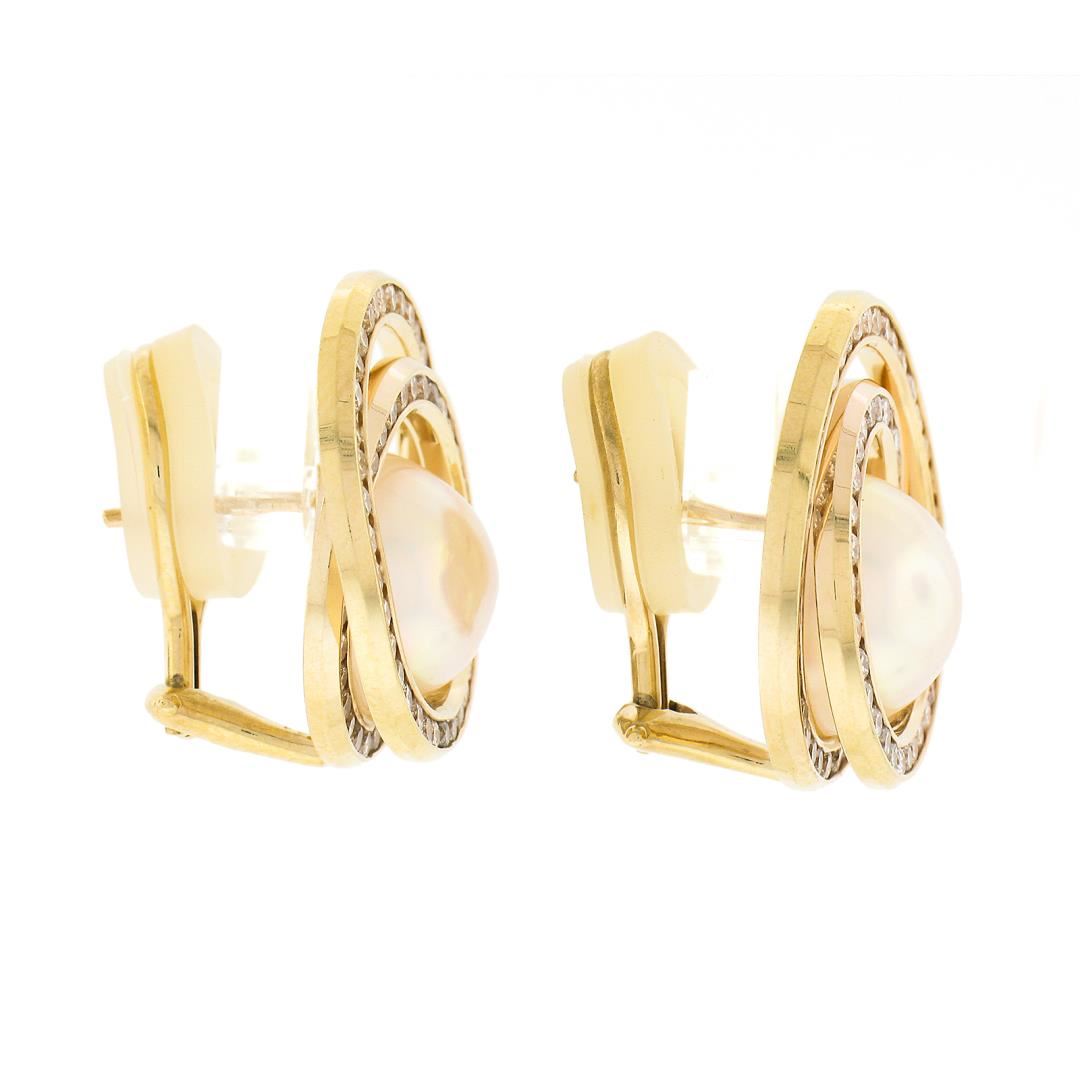 A solid 14k yellow gold button earrings, with 2 round shape cultured mabe pearls (11mm each), and 132 round brilliant cut natural diamonds (G/H - VS2/SI1 ; 1.75ctw). The earrings measure approximately 20.8x20.6mm and weigh a total of 11.28 grams.