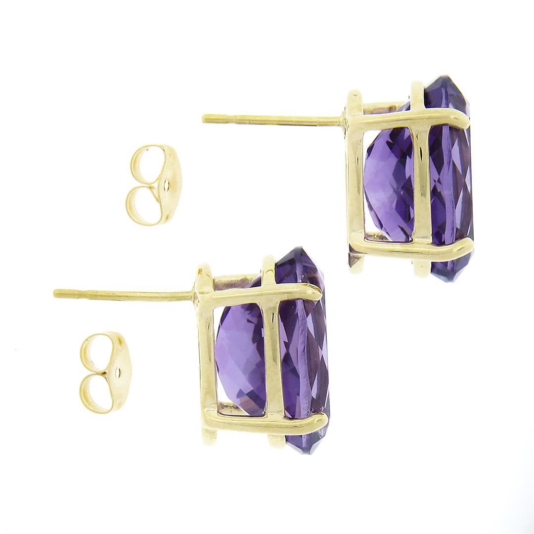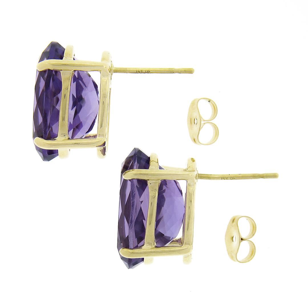 A solid 14k yellow gold stud earrings, with 2 oval cut natural amethysts (14x10mm - 13ctw). The earrings measure approximately 14.0x10.0mm and weigh a total of 5.55 grams.