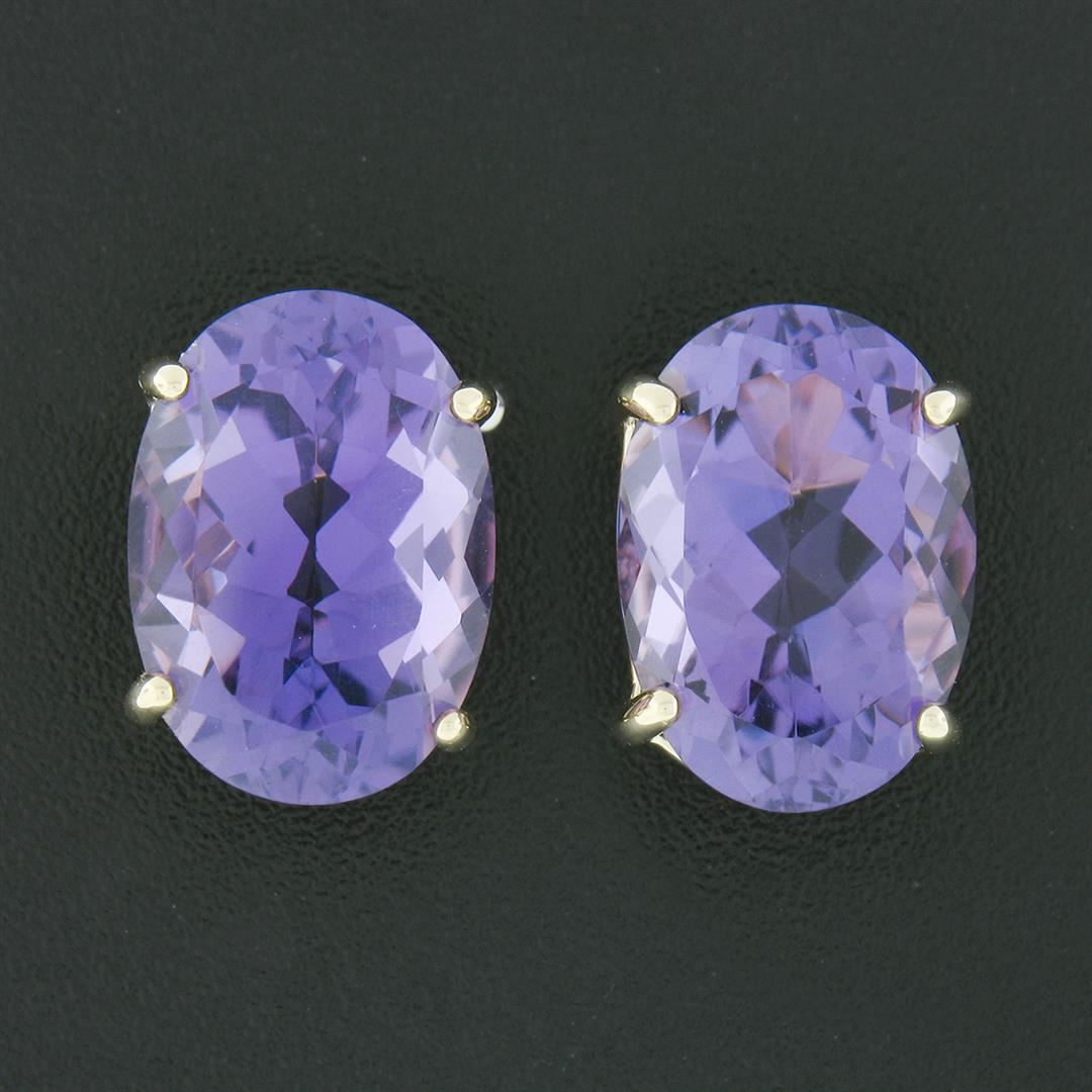 A solid 14k yellow gold stud earrings, with 2 oval cut natural amethysts (14x10mm - 13ctw). The earrings measure approximately 14.0x10.0mm and weigh a total of 5.55 grams.