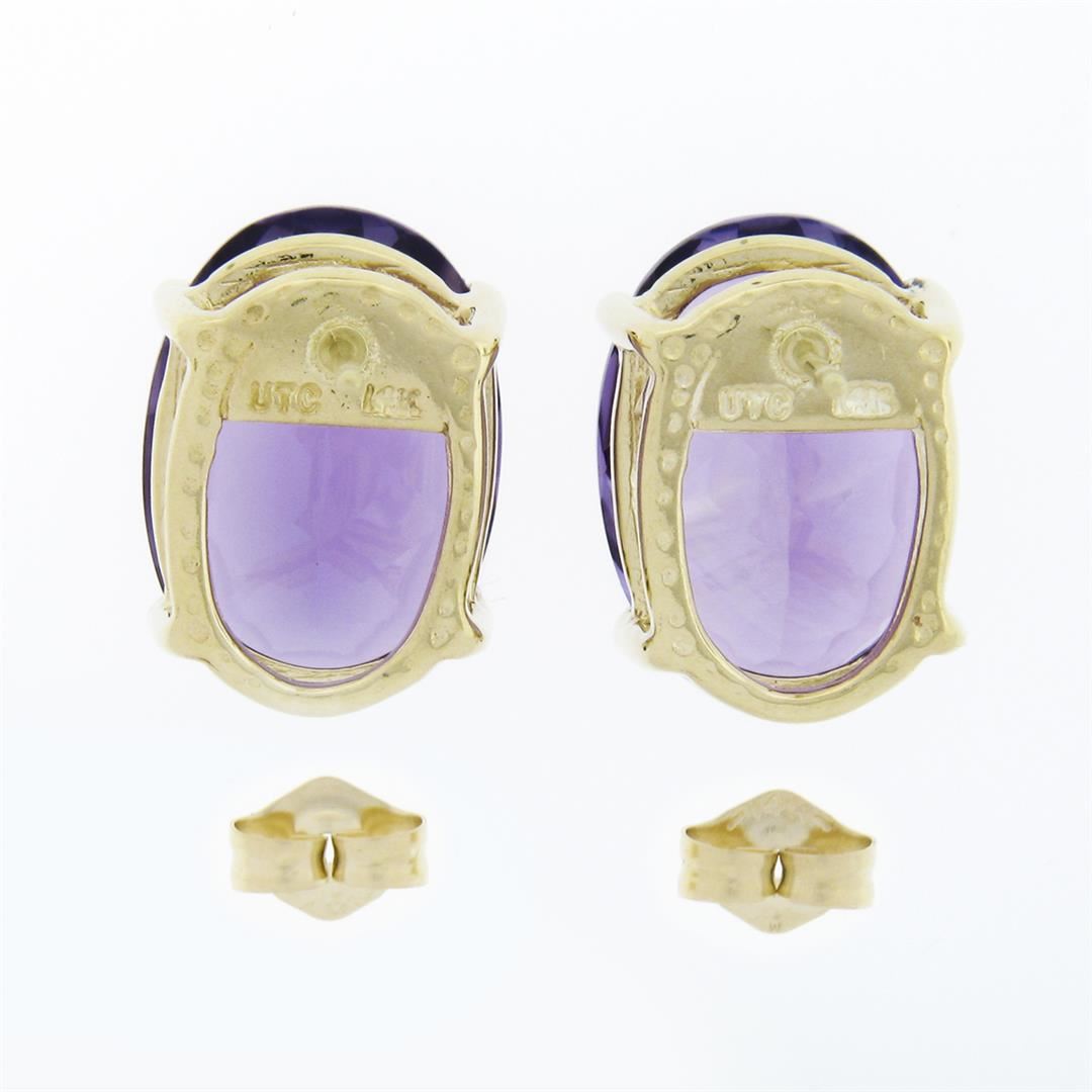 A solid 14k yellow gold stud earrings, with 2 oval cut natural amethysts (14x10mm - 13ctw). The earrings measure approximately 14.0x10.0mm and weigh a total of 5.55 grams.