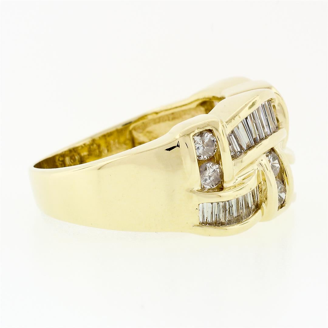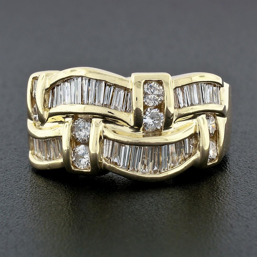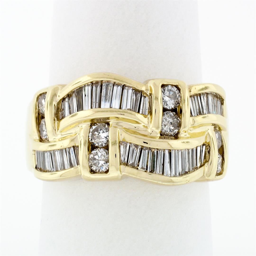 A solid 14k yellow gold wide band ring, with 38 baguette cut natural diamonds (H/I - VS2 to SI2; 1.35ctw), and 8 round brilliant cut natural diamonds (H/I - SI1/SI2; 0.75ctw). The ring is size 8.0, weighs a total of 9.46 grams, and measures 11.8mm wide.