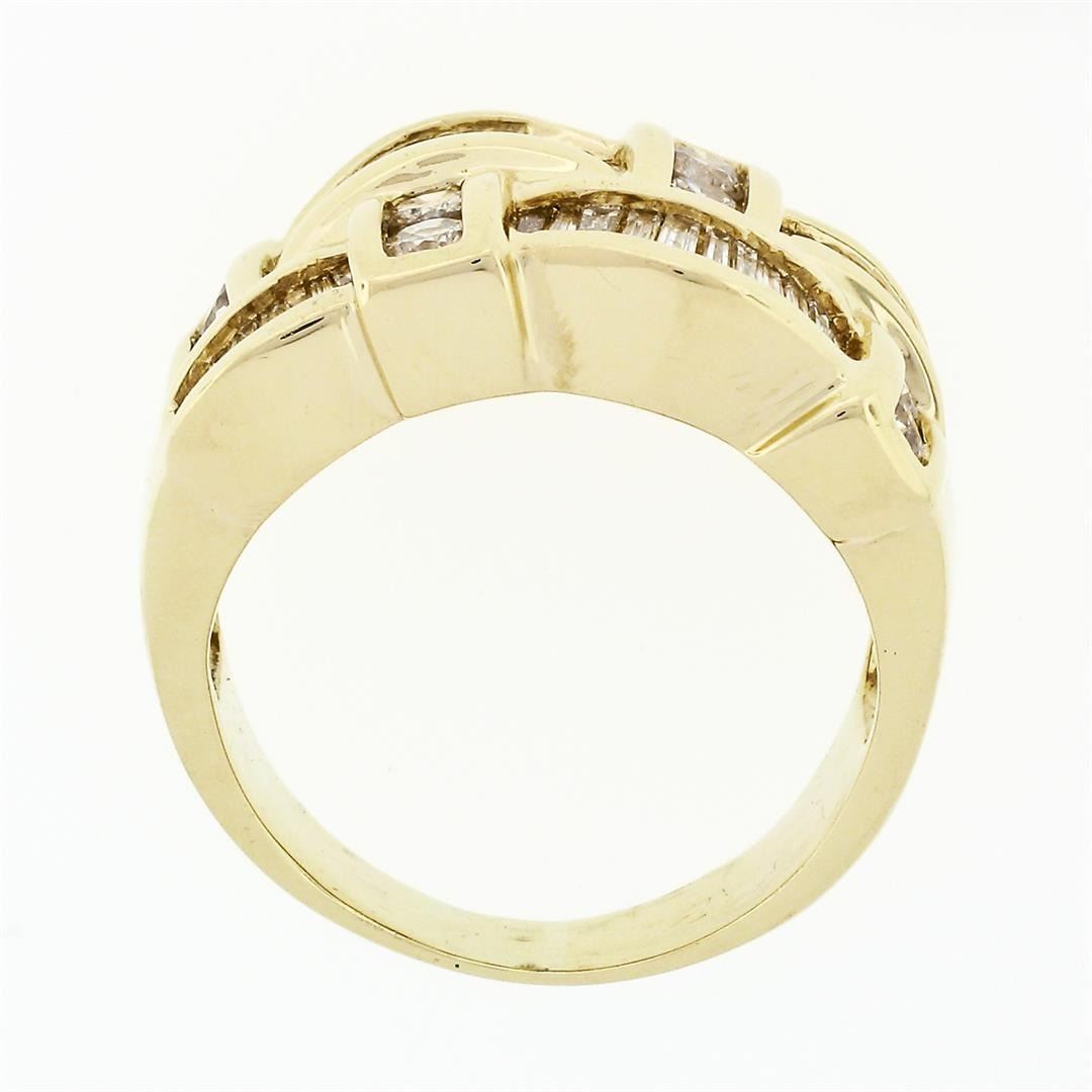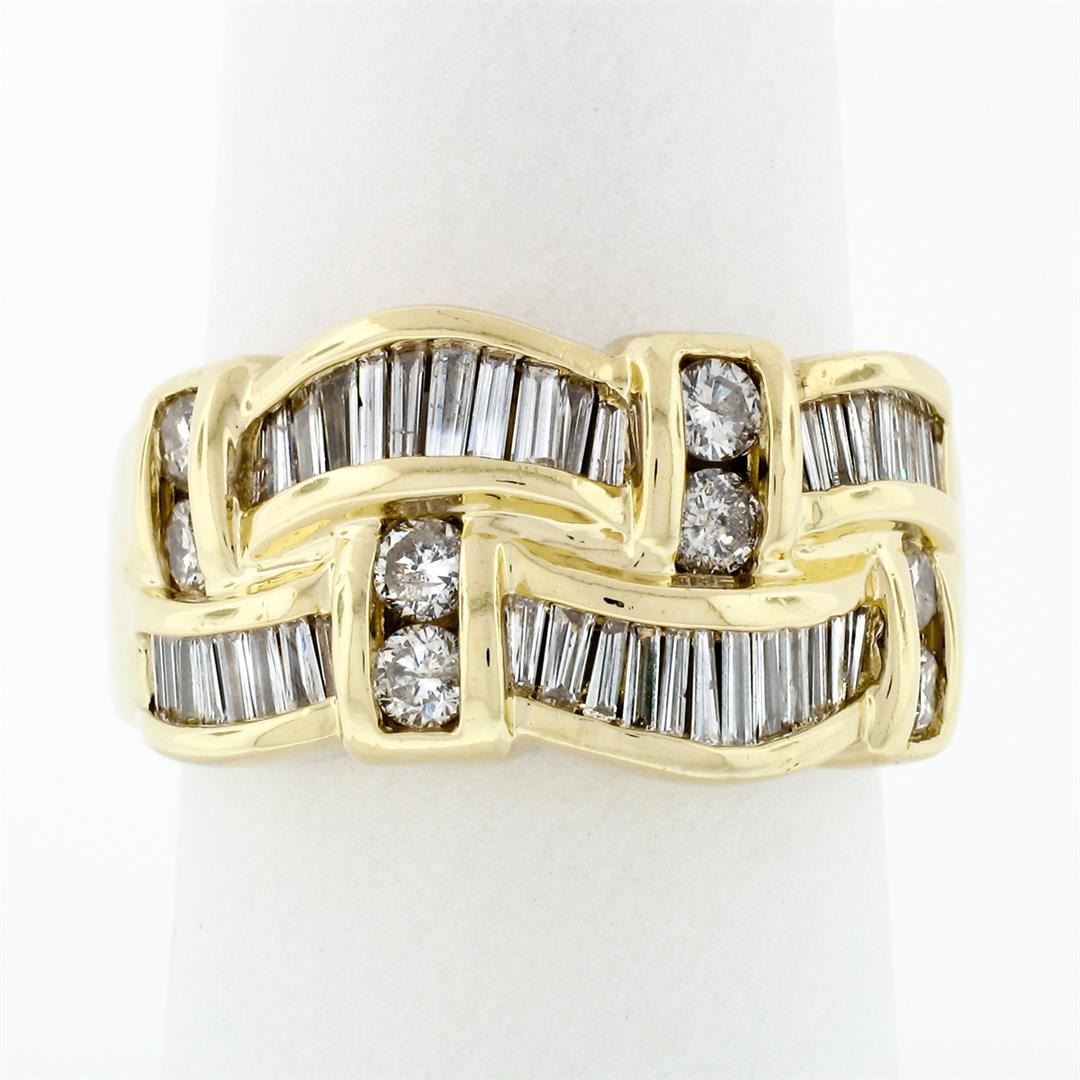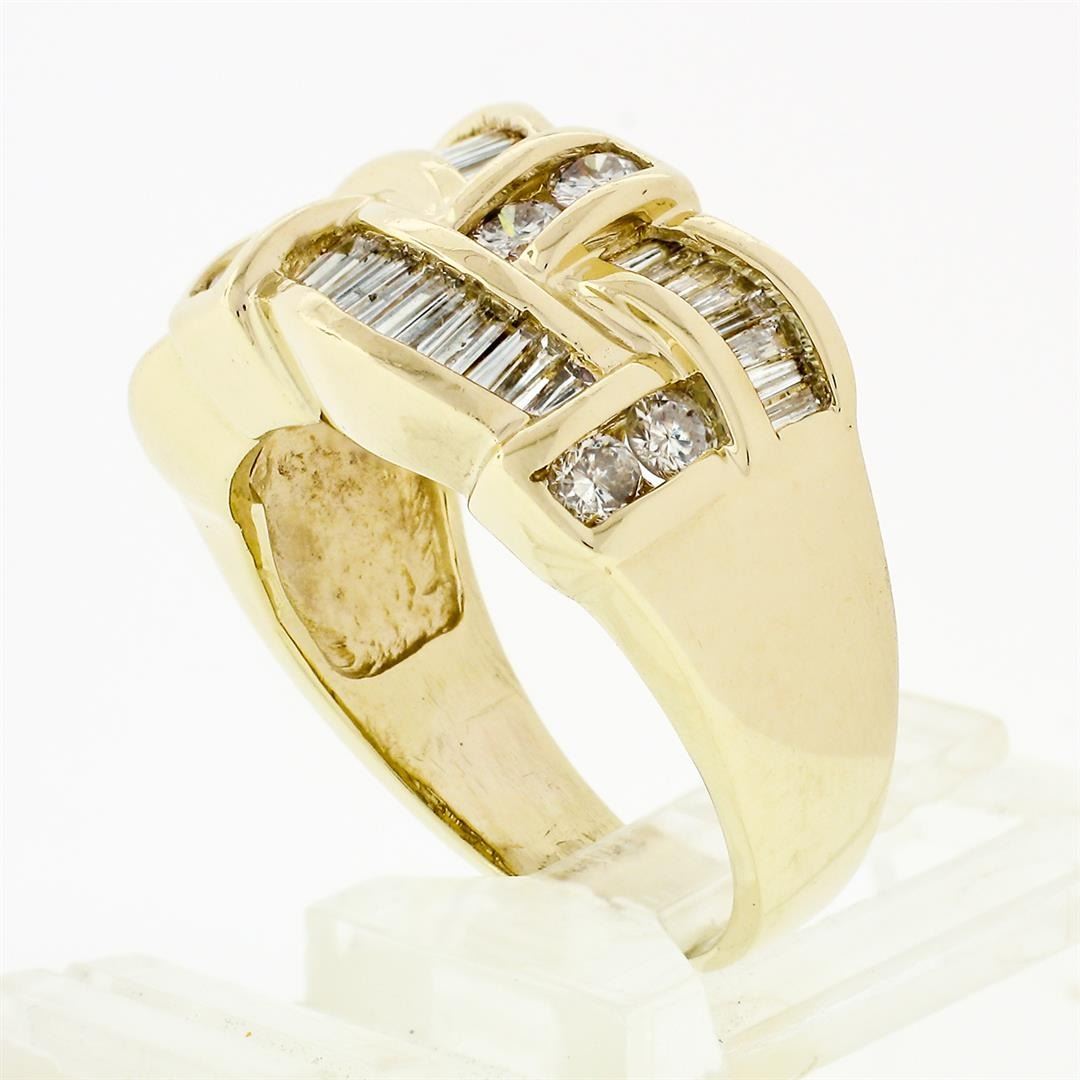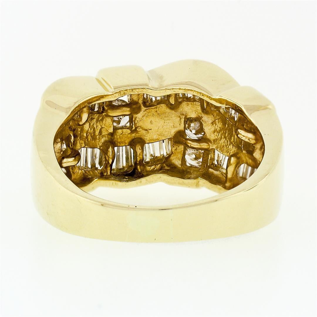 A solid 14k yellow gold wide band ring, with 38 baguette cut natural diamonds (H/I - VS2 to SI2; 1.35ctw), and 8 round brilliant cut natural diamonds (H/I - SI1/SI2; 0.75ctw). The ring is size 8.0, weighs a total of 9.46 grams, and measures 11.8mm wide.