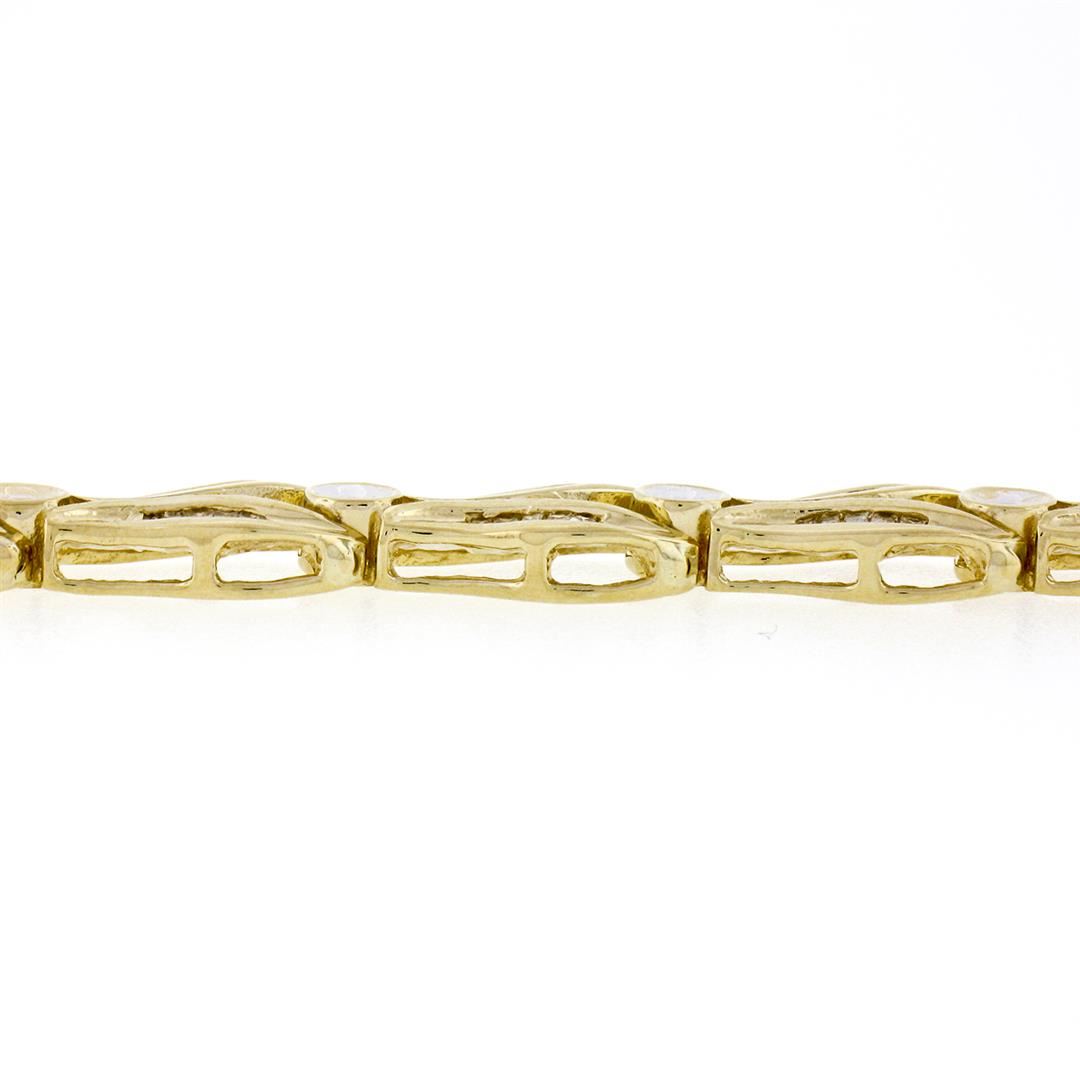 One 14K Yellow Gold 2.25ct Baguette Round Diamond Split & Bezel Link Tennis Bracelet. Item Details: Material: 14K Solid Yellow Gold, Weight: 17.97 Grams, Stone(s): (140) Natural Genuine Diamonds - Straight and Tapered Baguette Cut - Channel Set - SI2/I1 Clarity - I/J Color - 1.90ctw (approx.), (14) Natural Genuine Diamonds - Round Brilliant Cut - Bezel Set - SI2/I1 Clarity - I/J Color - 0.35ctw (approx.), Total Carat Weight: 2.25 (exact), Chain Type: Unique Split Link w/ Round, Bezel Stations, Chain Length: Fits up to 7 1/4 inch wrist, Clasp: Push clasp w/ fold under safety latch, Width: 8.45mm, Thickness: 3.55mm rise off the wrist, Condition: Like New!