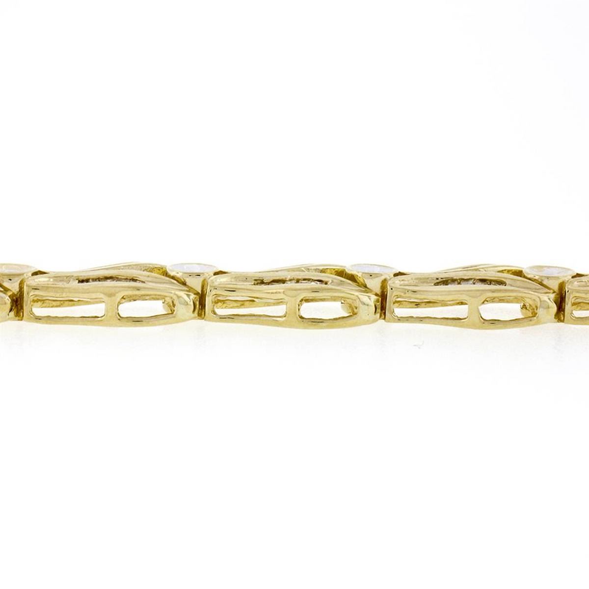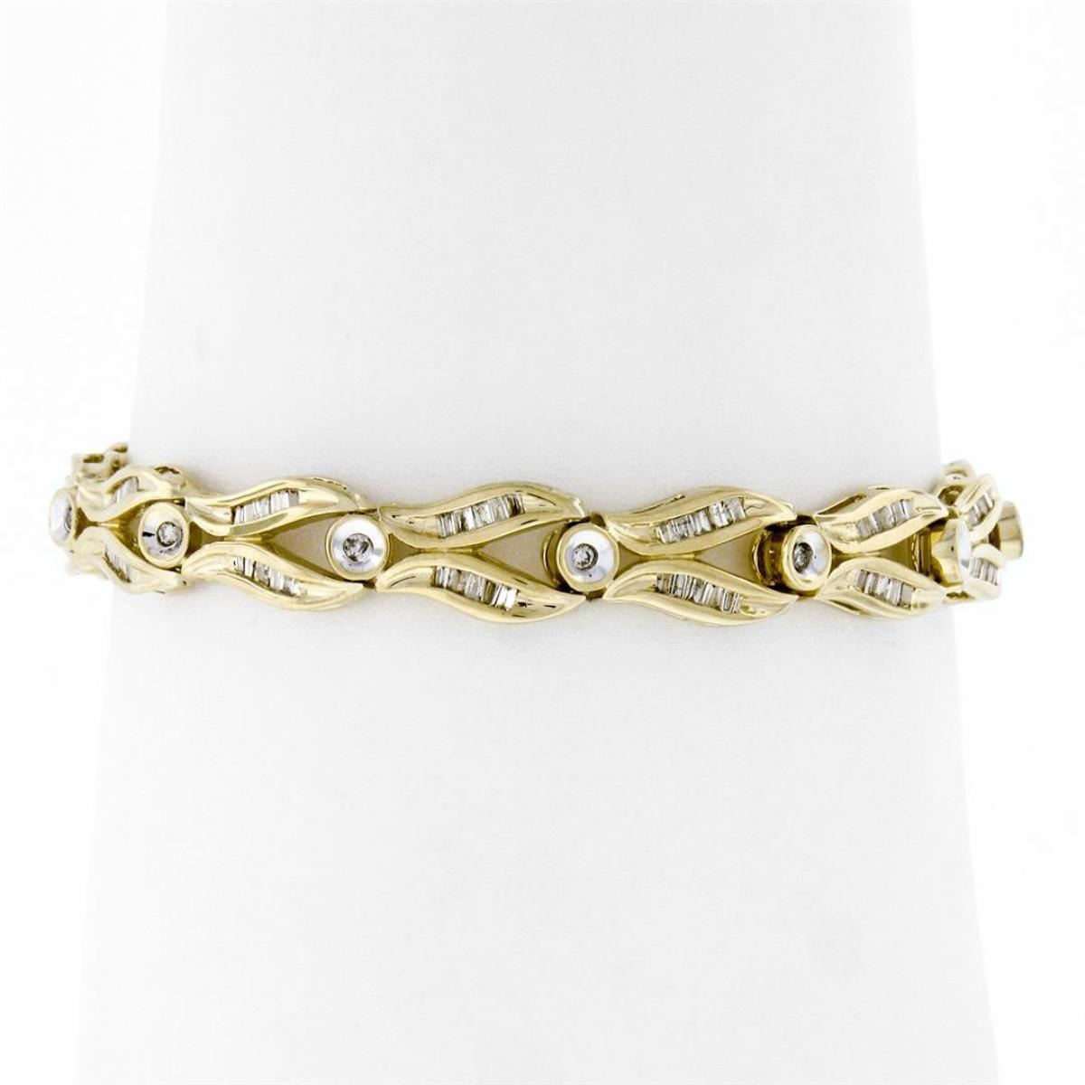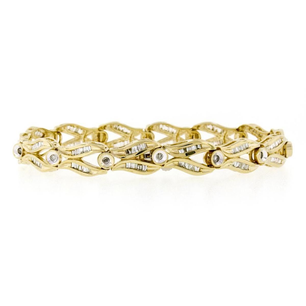 One 14K Yellow Gold 2.25ct Baguette Round Diamond Split & Bezel Link Tennis Bracelet. Item Details: Material: 14K Solid Yellow Gold, Weight: 17.97 Grams, Stone(s): (140) Natural Genuine Diamonds - Straight and Tapered Baguette Cut - Channel Set - SI2/I1 Clarity - I/J Color - 1.90 ctw (approx.), (14) Natural Genuine Diamonds - Round Brilliant Cut - Bezel Set - SI2/I1 Clarity - I/J Color - 0.35ctw (approx.), Total Carat Weight: 2.25 (exact), Chain Type: Unique Split Link w/ Round, Bezel Stations, Chain Length: Fits up to 7 1/4 inch wrist, Clasp: Push clasp w/ fold under safety latch, Width: 8.45mm, Thickness: 3.55mm rise off the wrist, Condition: Like New!
