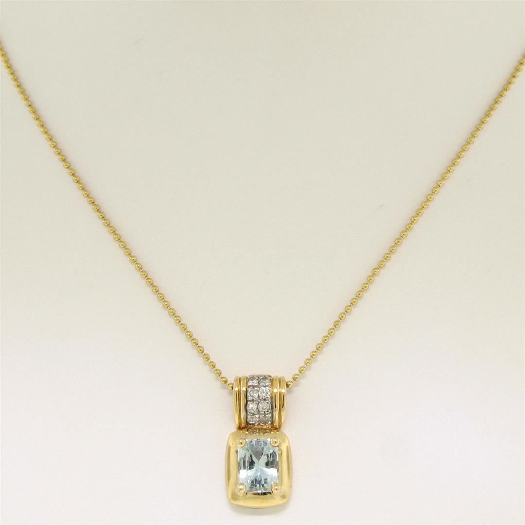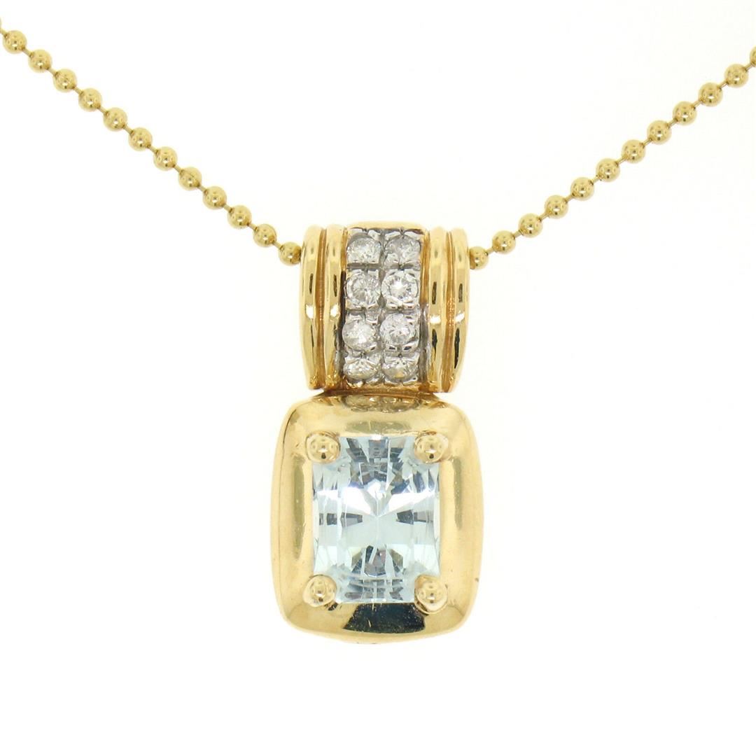 One 14K Yellow Gold 2.25ctw Emerald Cut RICH Aquamarine and Diamond Pendant w/ 16" Chain. Item Details - Material: 14K Solid Yellow Gold, Weight: 5.8 Grams, Stone(s): (1) Natural Genuine Aquamarine - Emerald Cut - Prong Set - Beautiful Ocean Blue Color - 2.00ct (approx.), (8) Natural Genuine Diamonds - Round Brilliant Cut - Bead Set - VS1 Clarity - G Color - 0.25ctw (approx.), Total Carat Weight: 2.25 (approx.), Chain Type: Bead Link, Chain Length: 16 Inches, Clasp: Spring Ring, Width: 10.6mm, Height (w/ Bail): 20.85mm, Thickness: 6.20mm, Condition: Amazing, like new condition!
