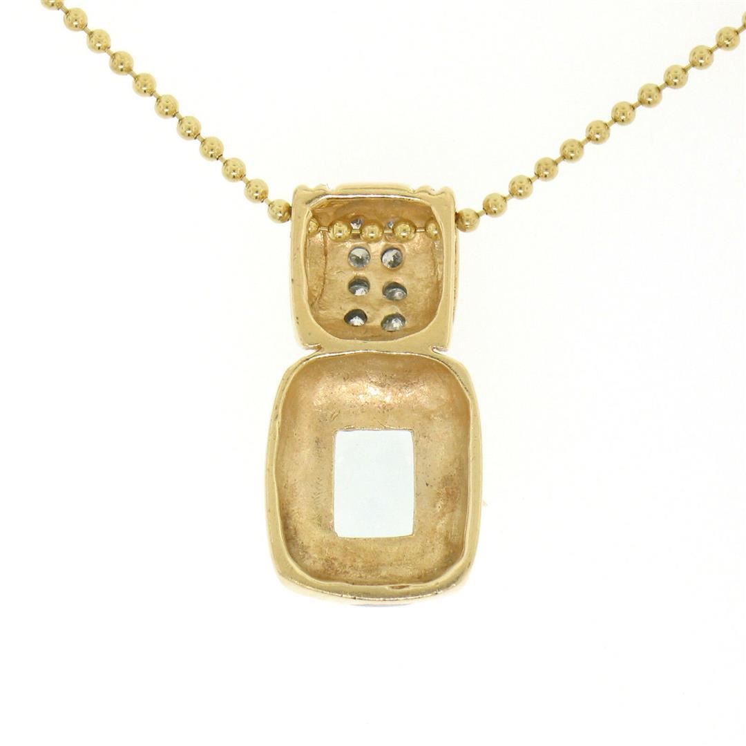 One 14K Yellow Gold 2.25ctw Emerald Cut RICH Aquamarine and Diamond Pendant w/ 16" Chain. Item Details - Material: 14K Solid Yellow Gold, Weight: 5.8 Grams, Stone(s): (1) Natural Genuine Aquamarine - Emerald Cut - Prong Set - Beautiful Ocean Blue Color - 2.00ct (approx.), (8) Natural Genuine Diamonds - Round Brilliant Cut - Bead Set - VS1 Clarity - G Color - 0.25ctw (approx.), Total Carat Weight: 2.25 (approx.), Chain Type: Bead Link, Chain Length: 16 Inches, Clasp: Spring Ring, Width: 10.6mm, Height (w/ Bail): 20.85mm, Thickness: 6.20mm, Condition: Amazing, like new condition!