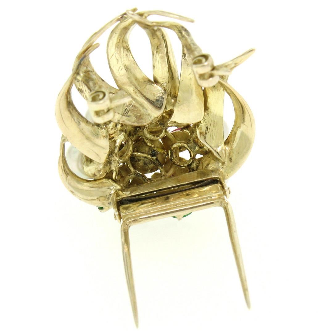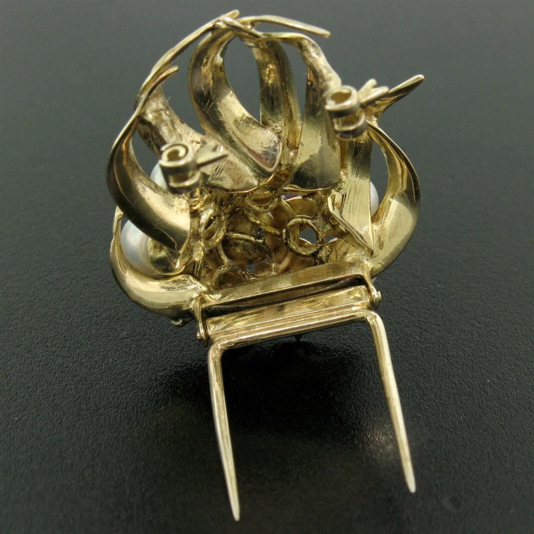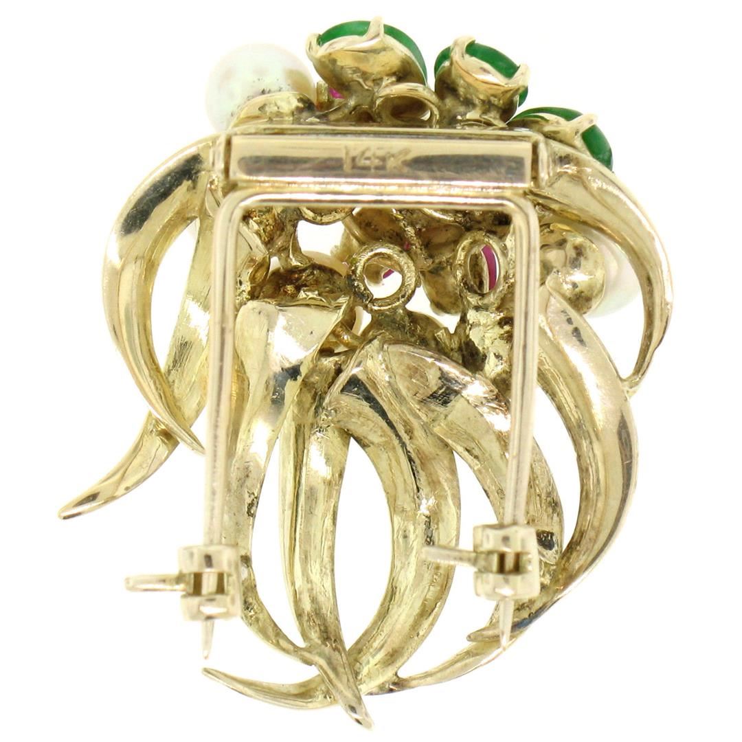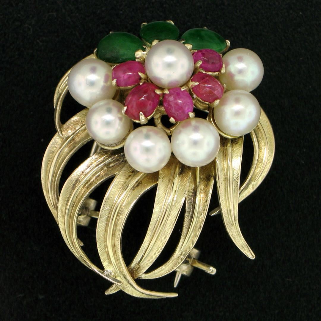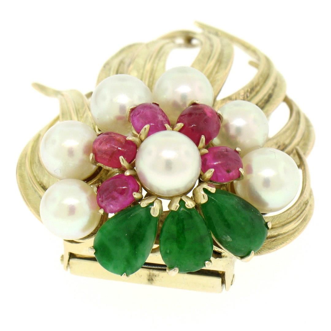 One 14K Yellow Gold 2.36ctw Cabochon Ruby Jade 5mm Pearl Textured Flower Brooch Pin. Item Details - Material: 14K Solid Yellow Gold, Total Weight: 9.3 Grams, Stone(s): (5) Natural Genuine Rubies - Oval Cabochon Cut - Prong Set - Amazing Red Color - 1.25ctw (approx.), (3) Natural Genuine Jade - Pear Cabochon Cut - Prong Set - Emerald Green w/ White Accents - 1.11ctw (approx.), (7) Akoya Peals - Ivory Color w/ Pink Luster - 5-5.3mm (approx.), Overall Height: 31.10mm, Overall Width: 52.2mm, Overall Thickness: 11mm (not including the pins), Clasp: Double Pin w/ Dual Swivel Locking Mechanism, Condition: Excellent, ready to wear condition!