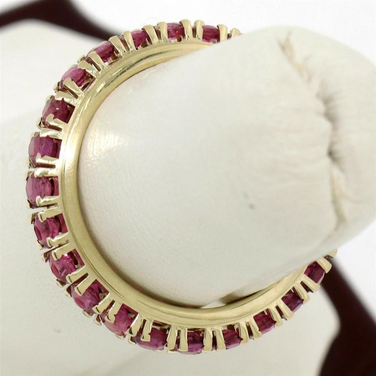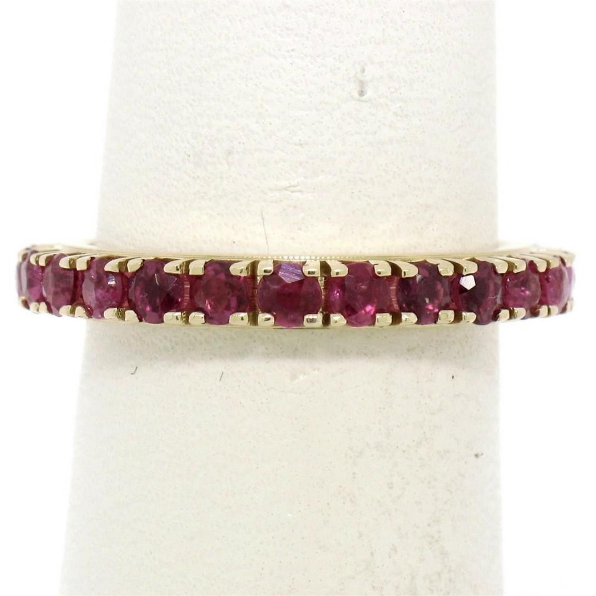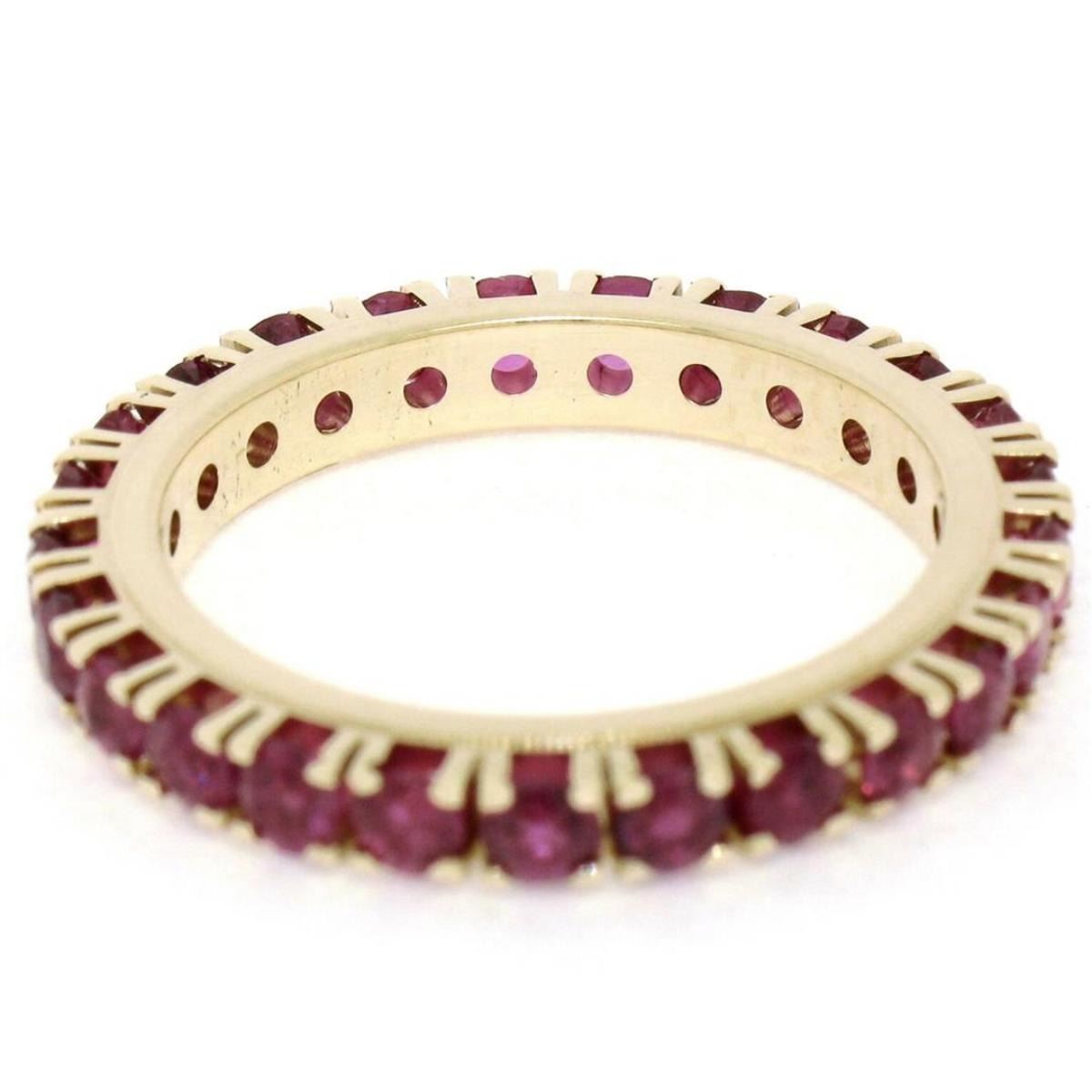 A solid 14k yellow gold eternity band prong set with 25 round brilliant cut natural blood red rubies (2.75ctw). The ring is size 6.0, weighs a total of 3.15 grams, and measures 2.95mm wide.