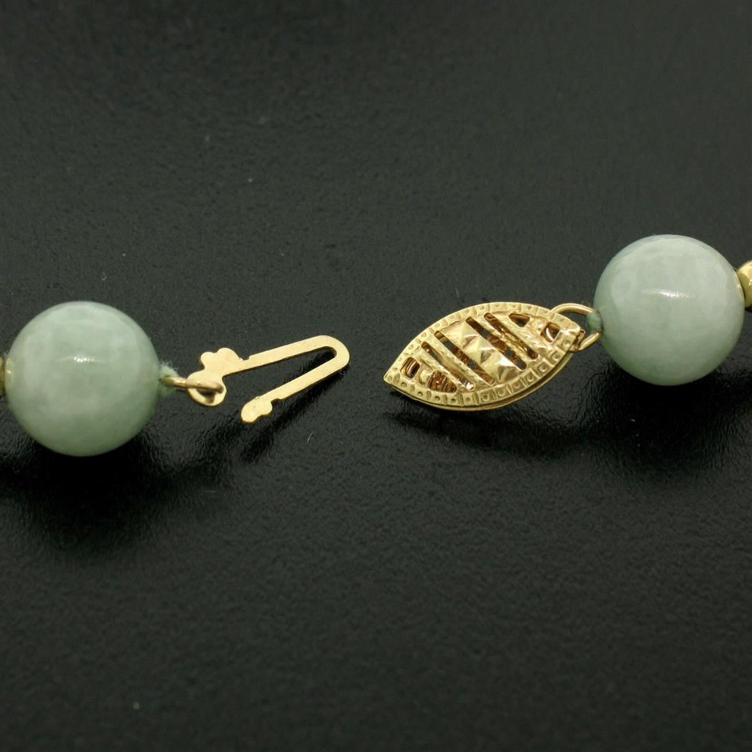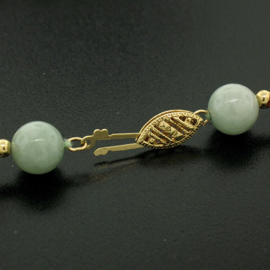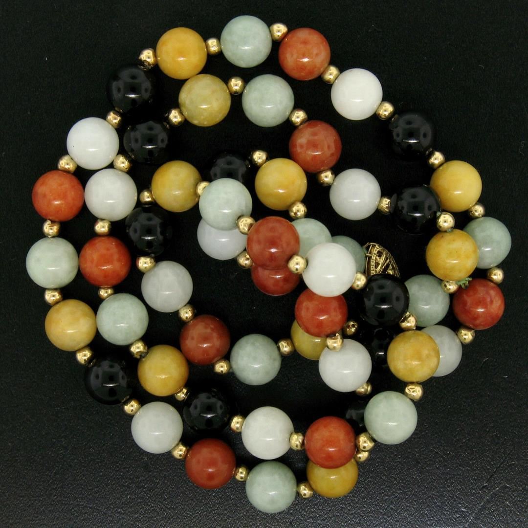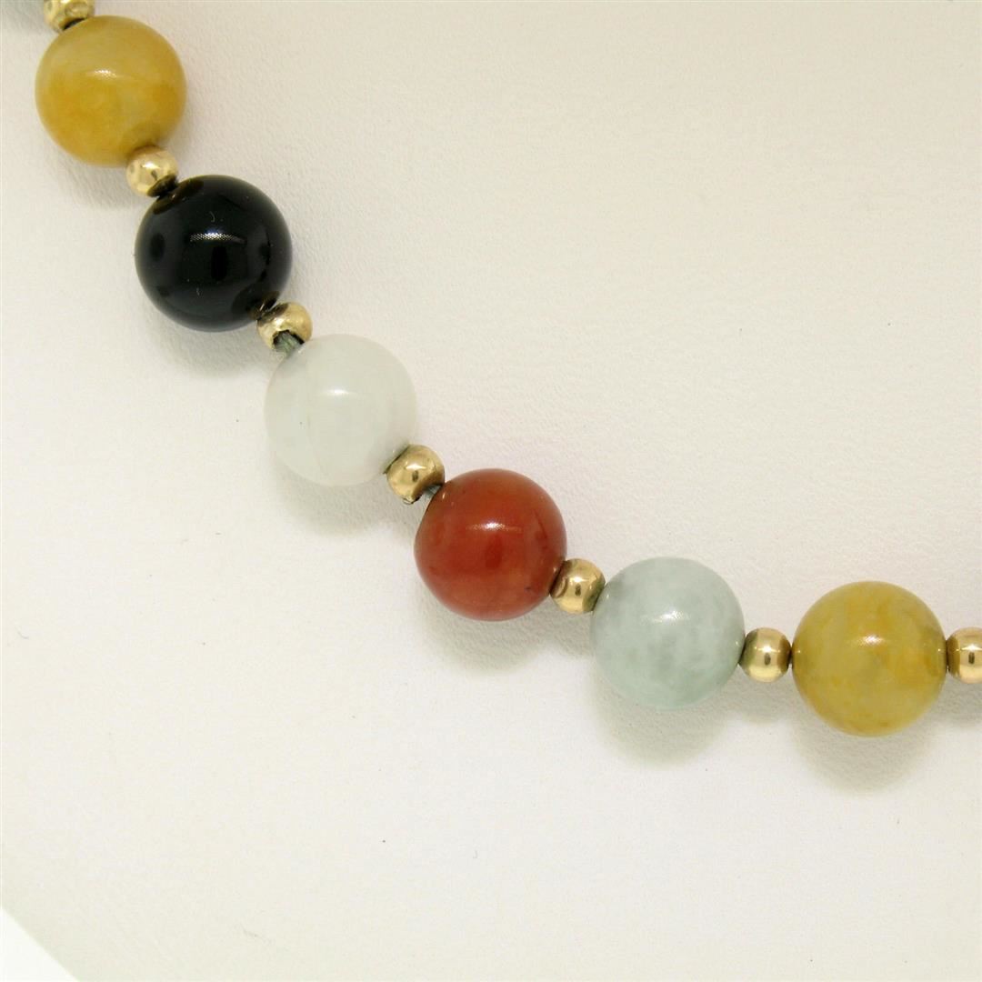One 14K Yellow Gold 24" Long Multi Colored 8.5mm Round Jade Bead Strand Necklace. Item Details: Material: 14K Solid Yellow Gold, Weight: 50.7 Grams, Chain Type: Gold & Jade Bead Necklace, Chain Length: 24 Inches, Chain Width: 8.5mm (the widest jade bead), Clasp: Safety Push Clasp (Hooks and then pushes in.), Condition: Excellent, ready to wear condition!,