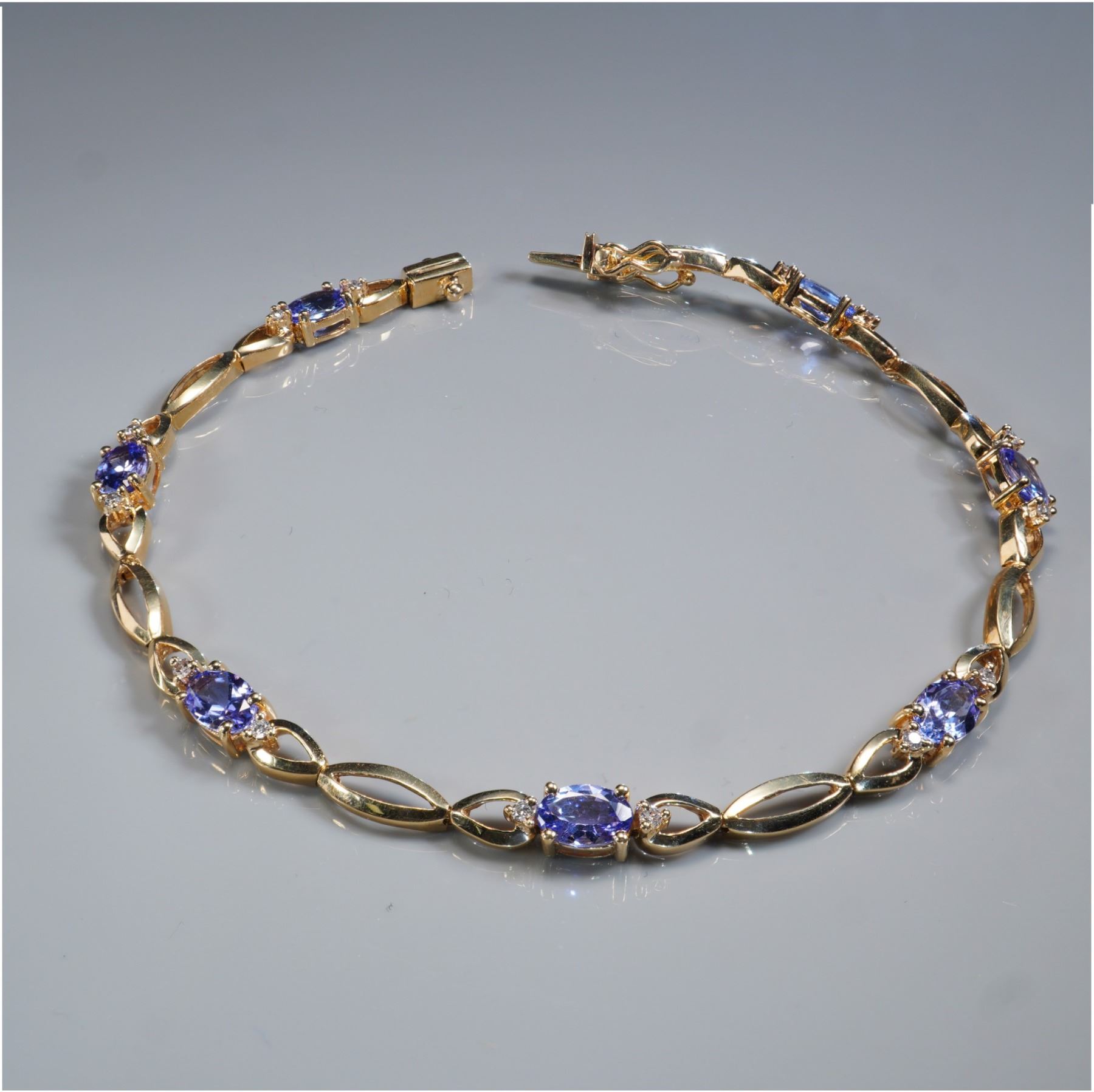 A graceful 14K yellow gold bracelet set with vivid oval-cut tanzanites totaling approximately 3.15 carats, accented by round-cut white diamonds totaling 0.17 carat. Each tanzanite exhibits rich blue-violet color and is framed by delicate diamond accents, connected by open gold links. The bracelet secures with a box clasp and safety latch, combining elegance with timeless craftsmanship.
