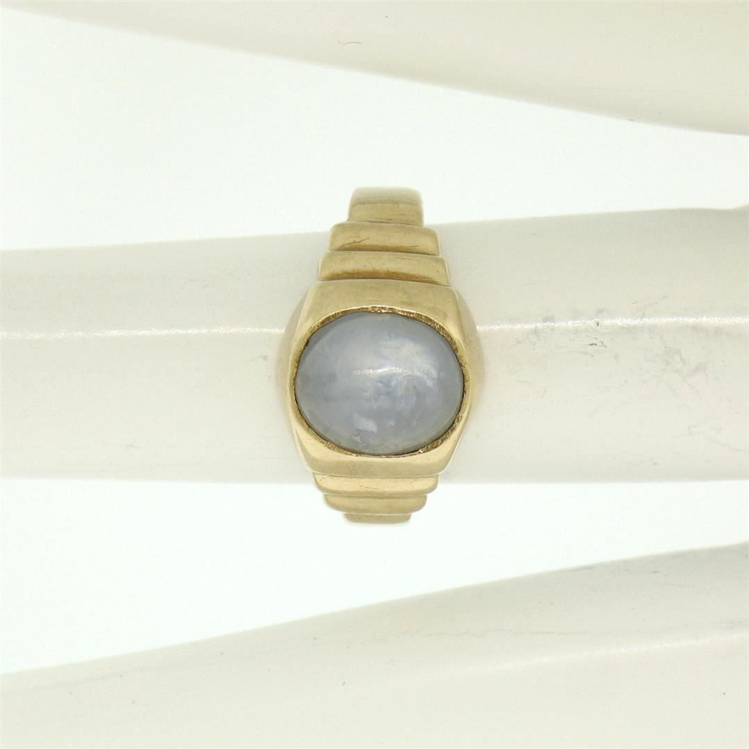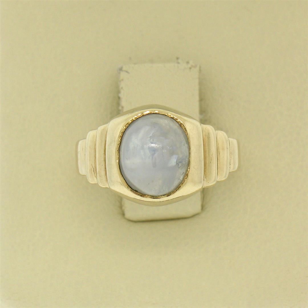 One Antique 14K Yellow Gold 3.50ct Oval Bezel Set Star Sapphire Grooved Step Ring. Item Details - Material: 14K Solid Yellow Gold, Weight: 4.3 Grams, Stone(s): (1) Natural Genuine Star Sapphire - Oval Shape - Bezel Set - Light Bluish-Grey Color, Total Carat Weight: 3.50 (approx.), Ring Size: 4.5, Ring Width: 10.45mm, Ring Height: 6.08mm rise off the finger, Condition: Antique piece in excellent condition. Original patina has been preserved.