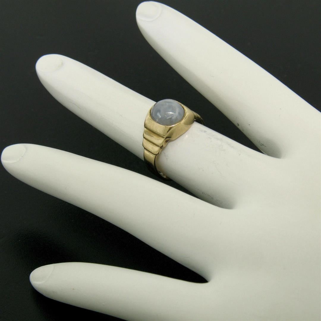 One Antique 14K Yellow Gold 3.50ct Oval Bezel Set Star Sapphire Grooved Step Ring. Item Details - Material: 14K Solid Yellow Gold, Weight: 4.3 Grams, Stone(s): (1) Natural Genuine Star Sapphire - Oval Shape - Bezel Set - Light Bluish-Grey Color, Total Carat Weight: 3.50 (approx.), Ring Size: 4.5, Ring Width: 10.45mm, Ring Height: 6.08mm rise off the finger, Condition: Antique piece in excellent condition. Original patina has been preserved.