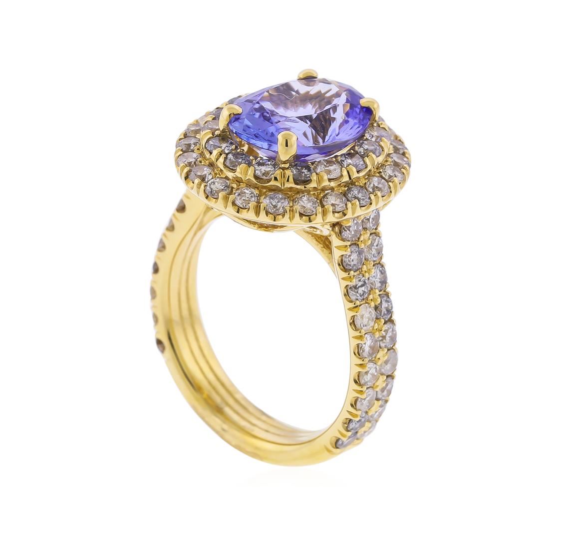 14K Yellow Gold 3.59ct Tanzanite and Diamond Ring. This ring contains (1) 3.59ct Tanzanite and approximately 2.29ctws of Round Brilliant Cut Diamonds. The total weight of the ring is 7.7 grams.