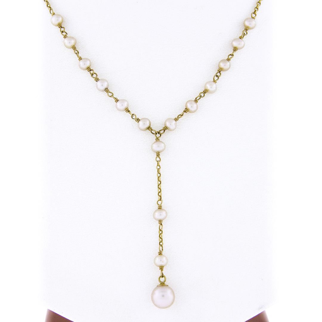 A solid 14k yellow gold drop dangle necklace, with 16 round shape cultured pearls (3.7mm to 6.3mm). It weighs a total of 3.13 grams, measures 3.7mm wide, and measures adjustable at 18 & 19 inches in length.