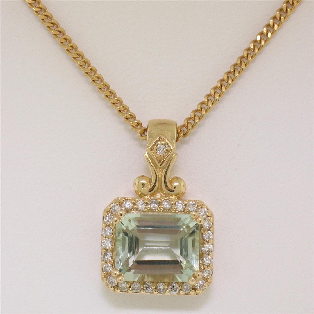 One NEW 14K Yellow Gold 3.77ctw VS Diamond Green Amethyst Pendant w/ 20" Curb Chain. Item Details - Material: 14K Solid Yellow Gold, Weight: 9.8 Grams, Stone(s): (26) Natural Genuine Diamonds - Round Brilliant Cut - Pavé Set - VS1/VS2 Clarity - F/G Color - 0.27ctw (approx.), (1) Natural Genuine Amethyst - Emerald Cut - Prong Set - Light Sea Green Color - 3.50ct (approx.), Total Carat Weight: 3.77 (approx.), Chain Type: Curb Link, Chain Length: 20 Inches, Clasp: Spring Ring, Width: 13.60mm, Height (w/ Bail): 21.33mm, Thickness: 6.66mm, Condition: Amazing - Like New Condition!