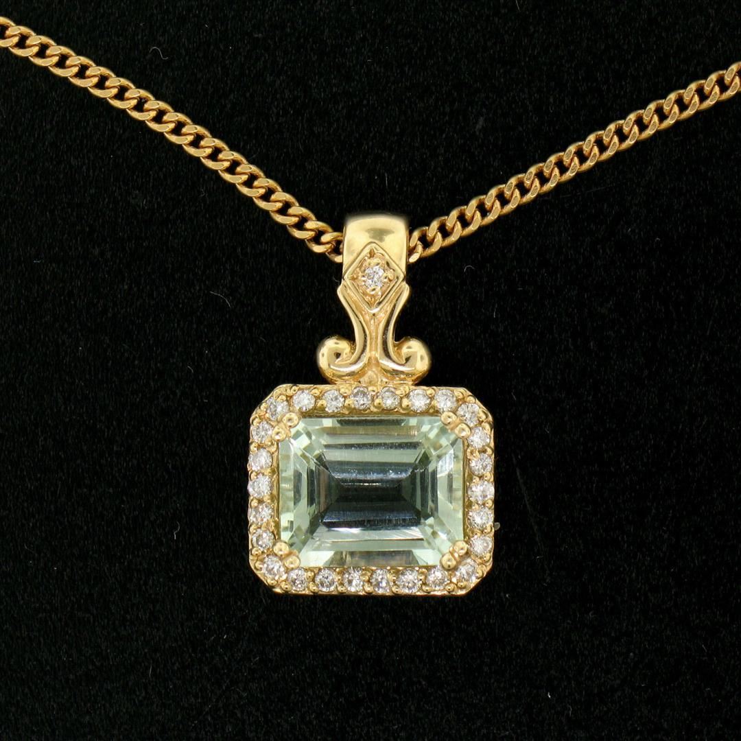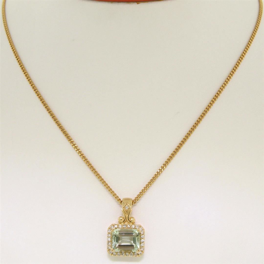 One NEW 14K Yellow Gold 3.77ctw VS Diamond Green Amethyst Pendant w/ 20" Curb Chain. Item Details - Material: 14K Solid Yellow Gold, Weight: 9.8 Grams, Stone(s): (26) Natural Genuine Diamonds - Round Brilliant Cut - Pavé Set - VS1/VS2 Clarity - F/G Color - 0.27ctw (approx.), (1) Natural Genuine Amethyst - Emerald Cut - Prong Set - Light Sea Green Color - 3.50ct (approx.), Total Carat Weight: 3.77 (approx.), Chain Type: Curb Link, Chain Length: 20 Inches, Clasp: Spring Ring, Width: 13.60mm, Height (w/ Bail): 21.33mm, Thickness: 6.66mm, Condition: Amazing - Like New Condition!
