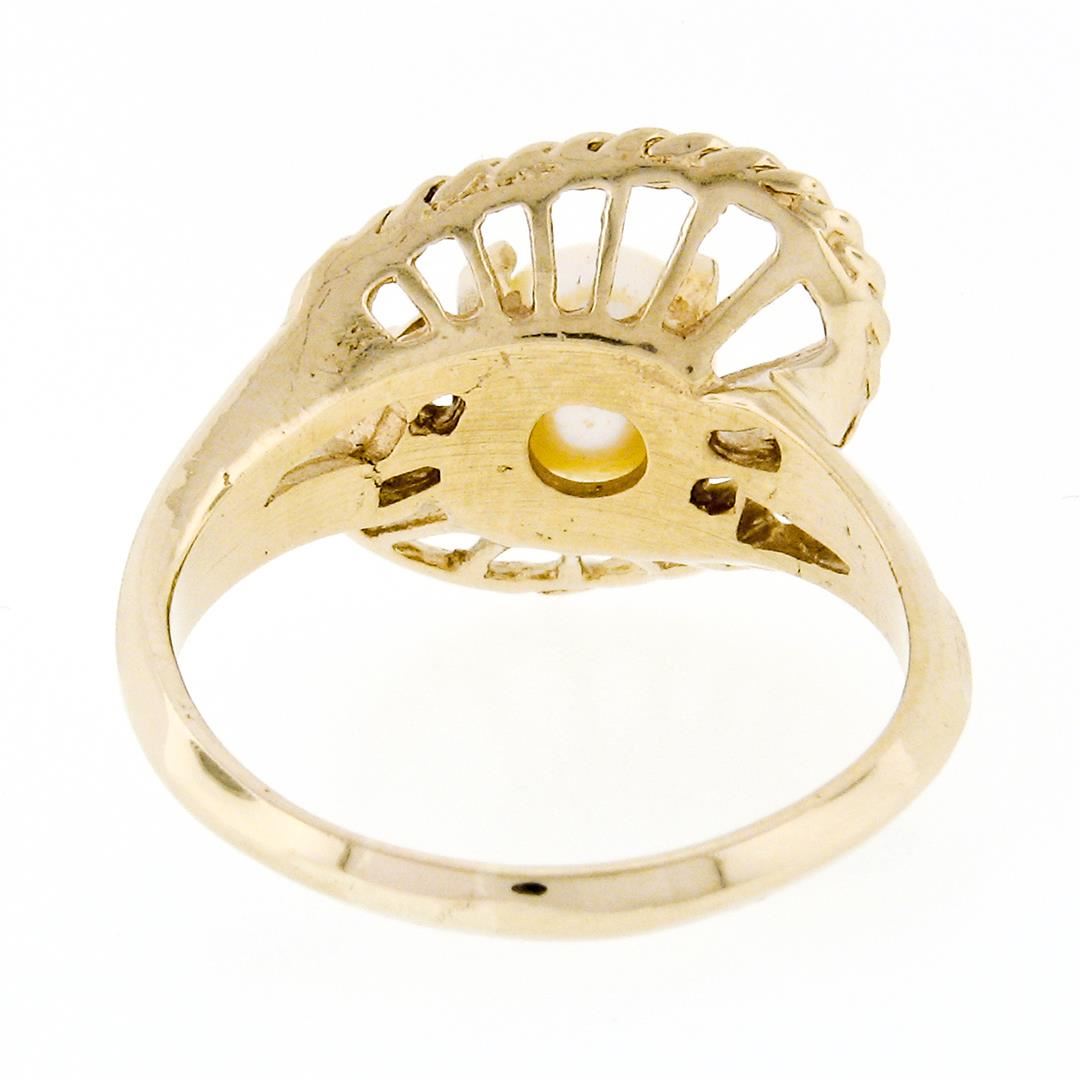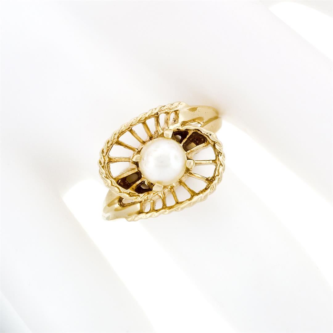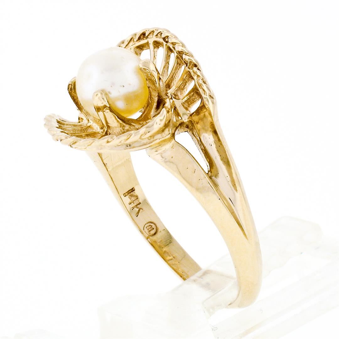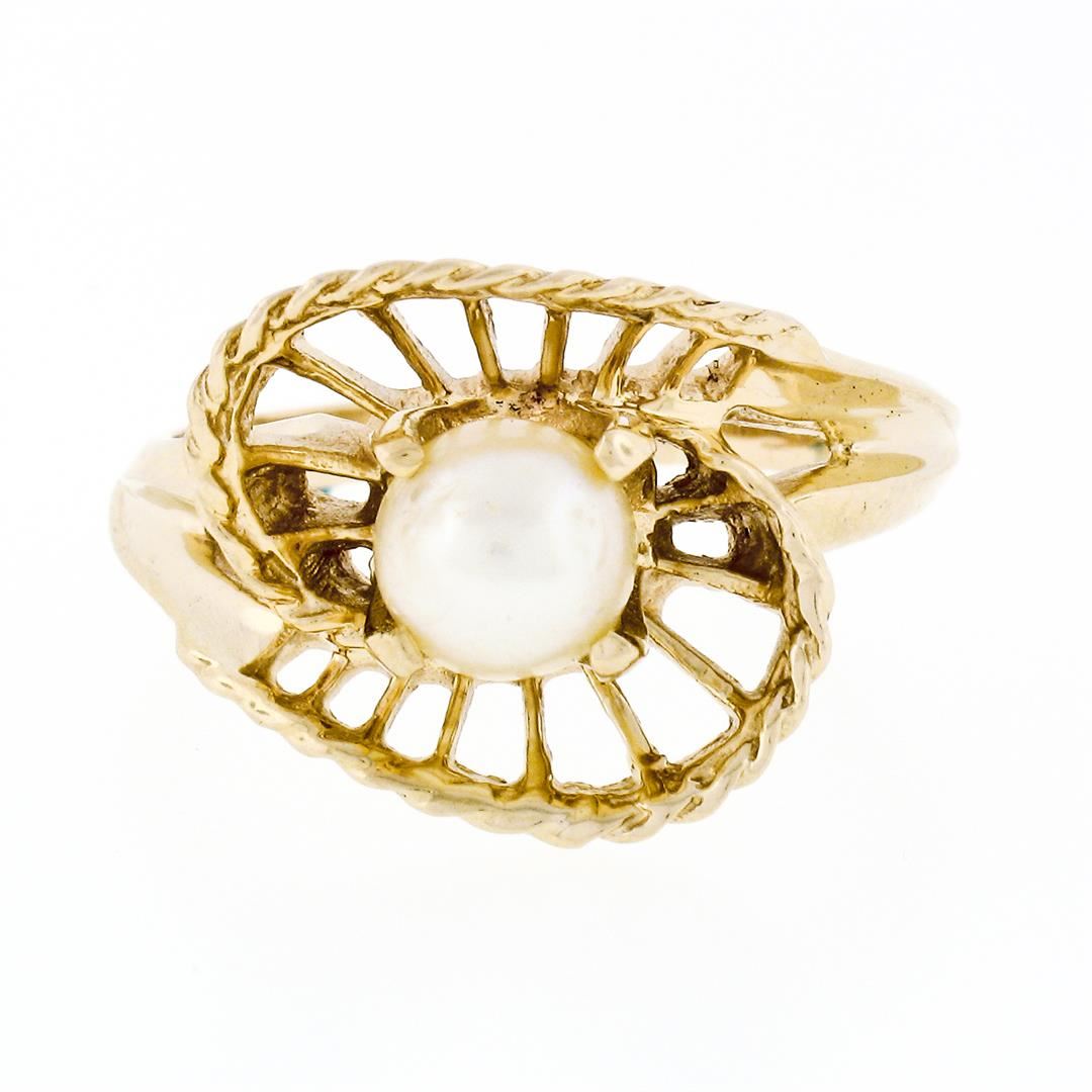 14K Yellow Gold 6.0mm Pearl Solitaire Wave Bypass Shell Open Work Cocktail Ring