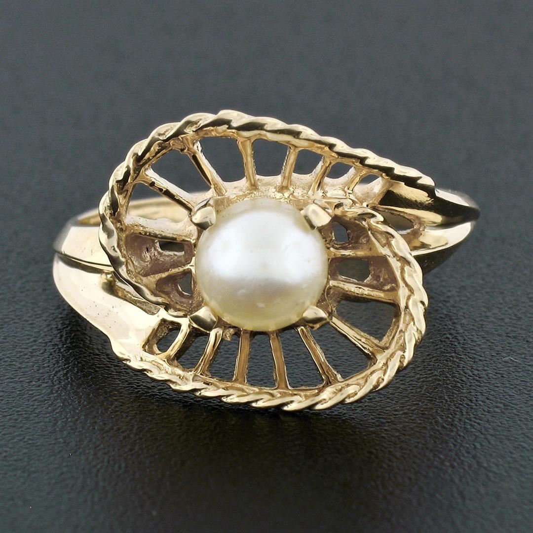 An estate solid 14k yellow gold bypass ring, with 1 round shape natural pearl (6.0mm). The ring is size 7, weighs a total of 4.2 grams, and measures 14.0mm wide.