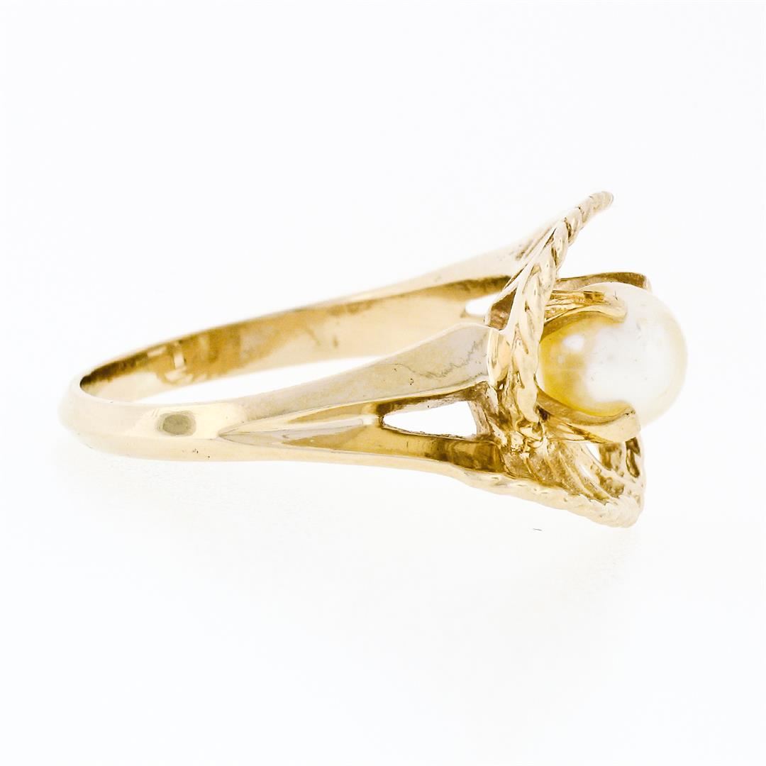 An estate solid 14k yellow gold bypass ring, with 1 round shape natural pearl (6.0mm). The ring is size 7, weighs a total of 4.2 grams, and measures 14.0mm wide.