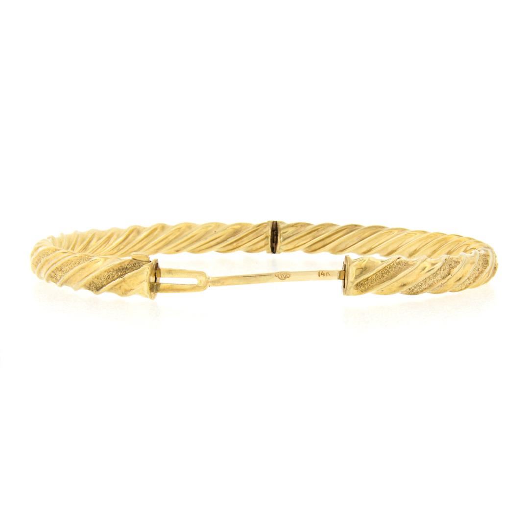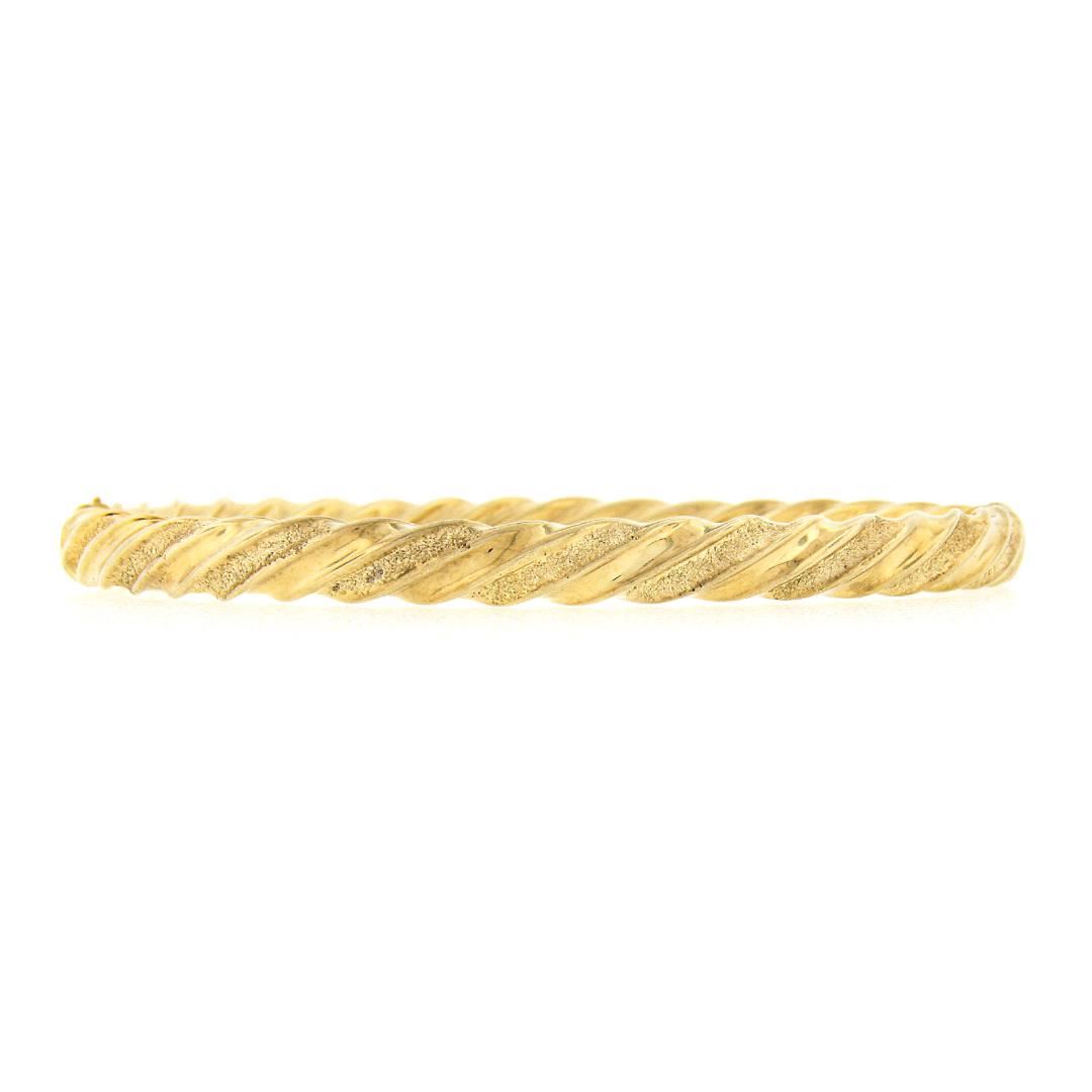 A solid 14k yellow gold bangle bracelet. It weighs a total of 8.35 grams, measures 5.6mm wide, and measures 6.5 inches in length.