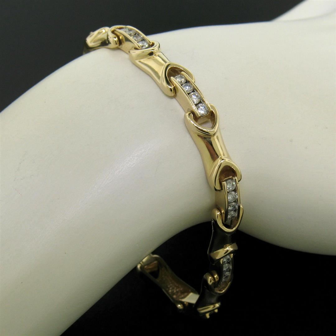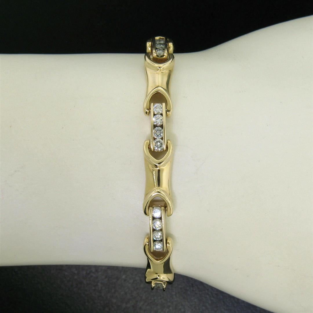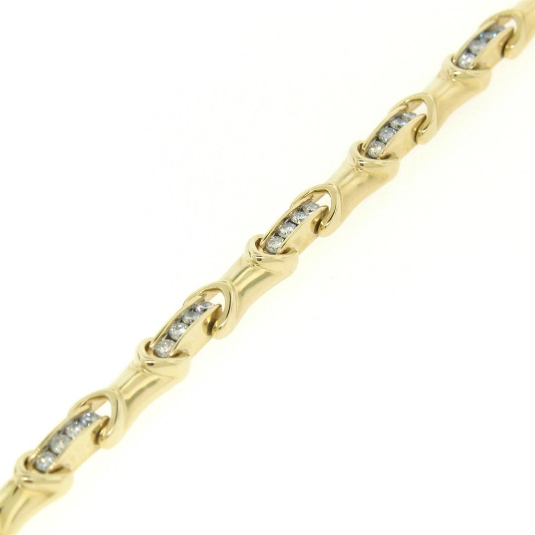 One 14K Yellow Gold 7" 2.16ctw Channel Set Round Brilliant Diamond Tennis Bracelet. Item Details: Material: 14k Solid Yellow Gold, Weight: 17.06 Grams, Stone(s): (36) Natural Genuine Diamonds - Round Brilliant Cut - Channel Set - VS2 Clarity - G/H Color, Total Carat Weight: 2.16 (approx.), Length: 7 Inches, Clasp: Push Clasp w/ Safety Latch, Width: 6mm at the Yellow Gold Bars, Height: 4.17mm Condition: Like New!