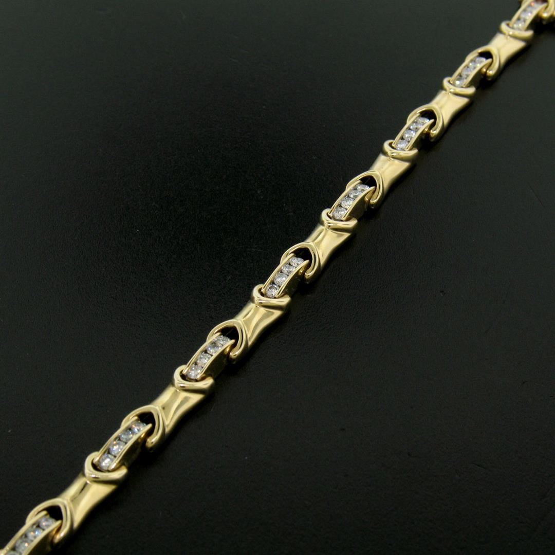 One 14K Yellow Gold 7" 2.16ctw Channel Set Round Brilliant Diamond Tennis Bracelet. Item Details: Material: 14k Solid Yellow Gold, Weight: 17.06 Grams, Stone(s): (36) Natural Genuine Diamonds - Round Brilliant Cut - Channel Set - VS2 Clarity - G/H Color, Total Carat Weight: 2.16 (approx.), Length: 7 Inches, Clasp: Push Clasp w/ Safety Latch, Width: 6mm at the Yellow Gold Bars, Height: 4.17mm Condition: Like New!