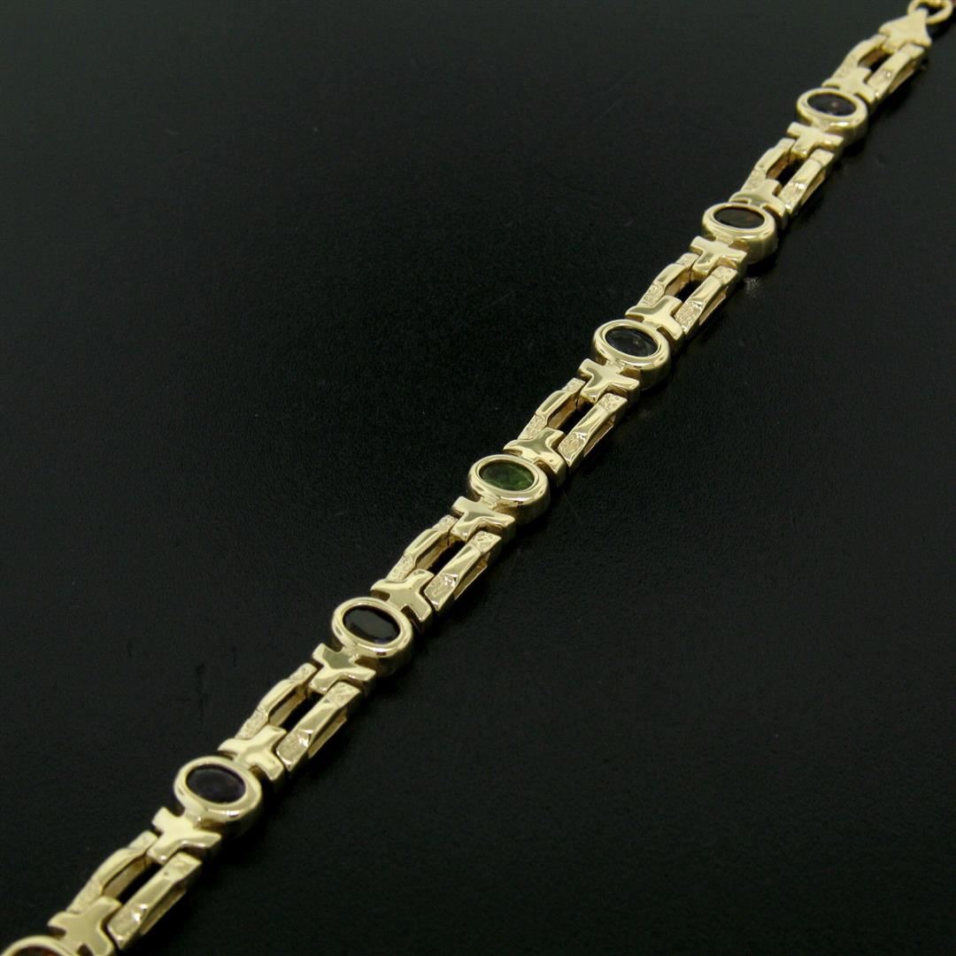 A solid 14k yellow gold bracelet bezel set with 2 natural amethysts (0.60ctw), 2 natural citrines (0.60ctw), a natural peridot (0.30ct), a natural garnet (0.30ct), and a natural blue topaz (0.30ct). It weighs a total of 19.41 grams, measures 7.70mm wide, and measures 7 inches in length.