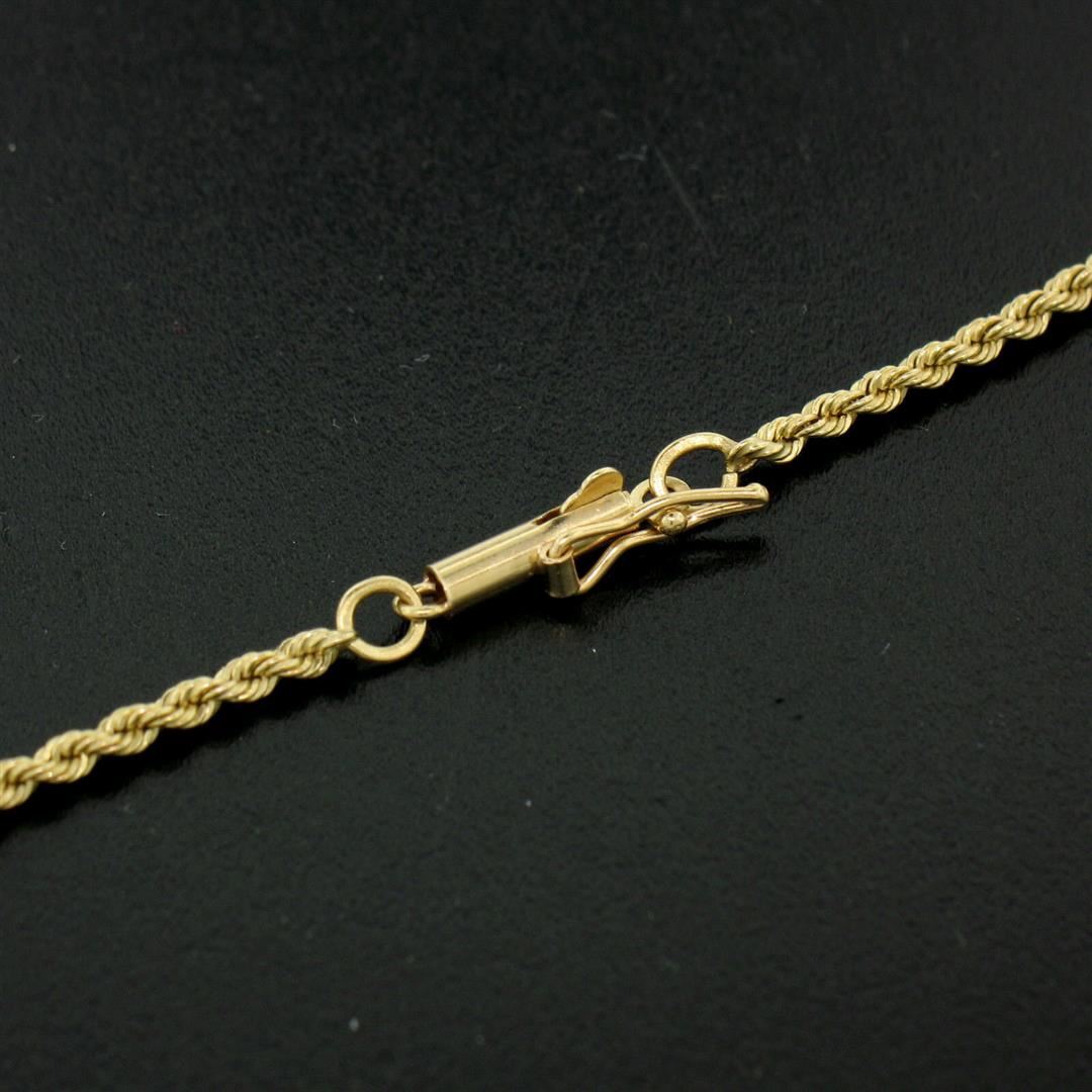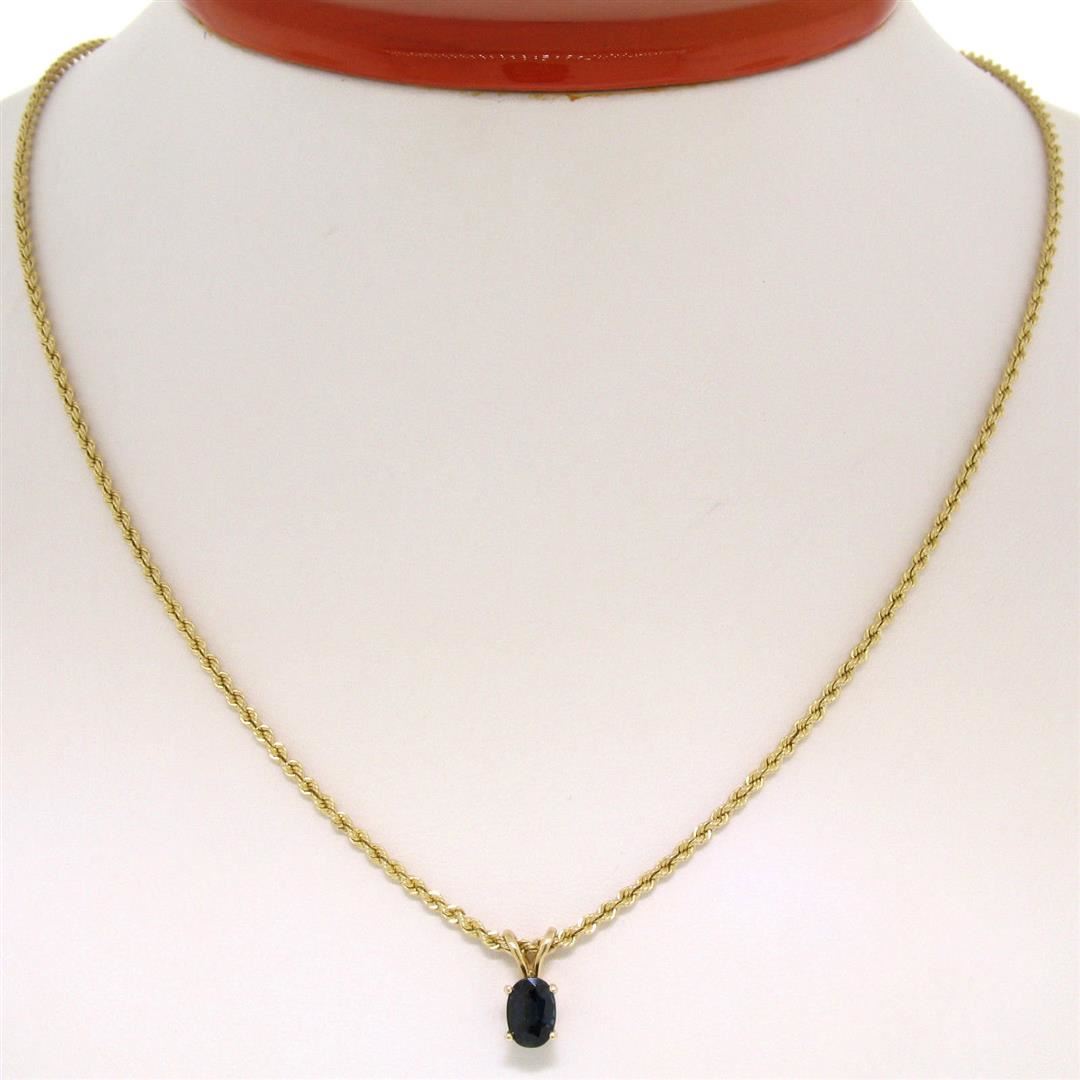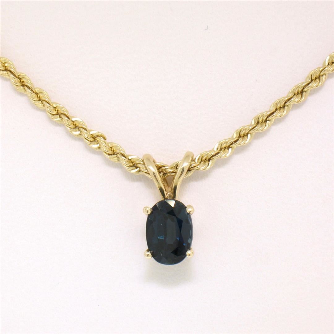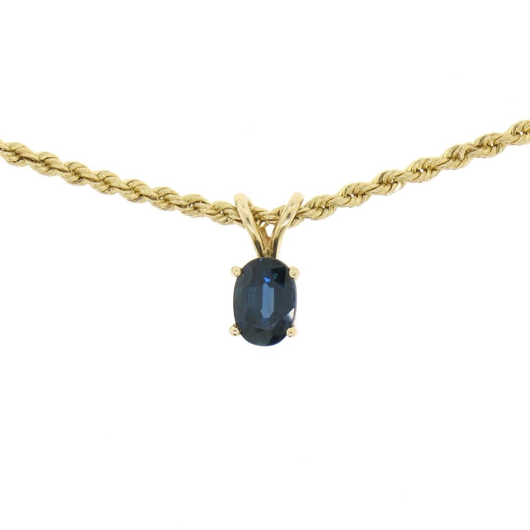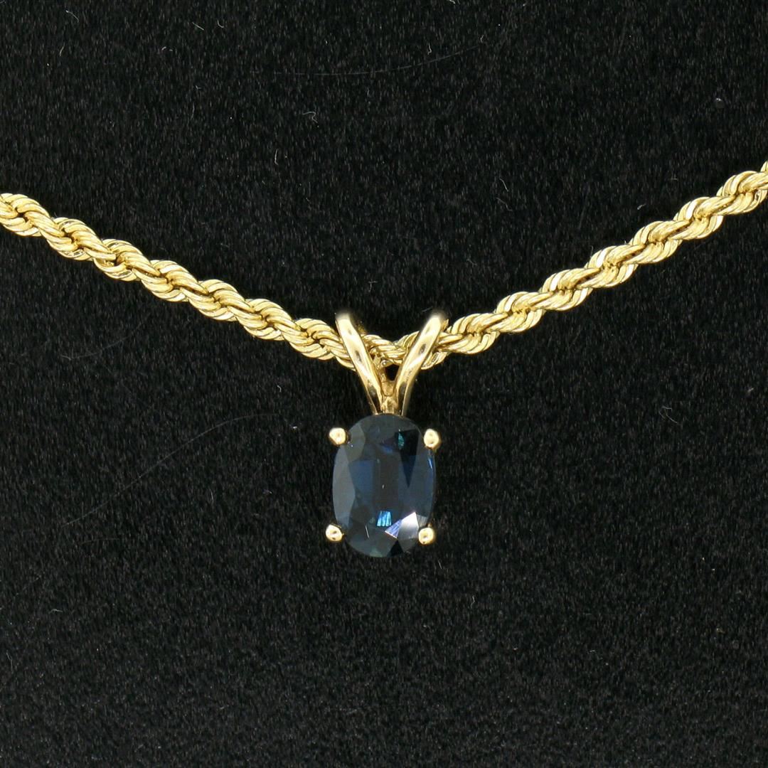 One 14K Yellow Gold .75ct Oval Cut Sapphire Solitaire Pendant w/ 18" Rope Chain 6.6g. Item Details - Material: 14K Solid Yellow Gold, Weight: 6.6 Grams, Stone(s): (1) Natural Genuine Sapphire - Oval Cut - Prong Set - Deep Royal Blue Color - 0.75ct (approx.), Chain Type: Rope Chain, Chain Length: 18 Inches, Clasp: Barrel Clasp w/ Safety Latch, Width: 5.29mm, Height (w/ Bail): 11.55mm, Thickness: 5.10mm, Condition: Like New!