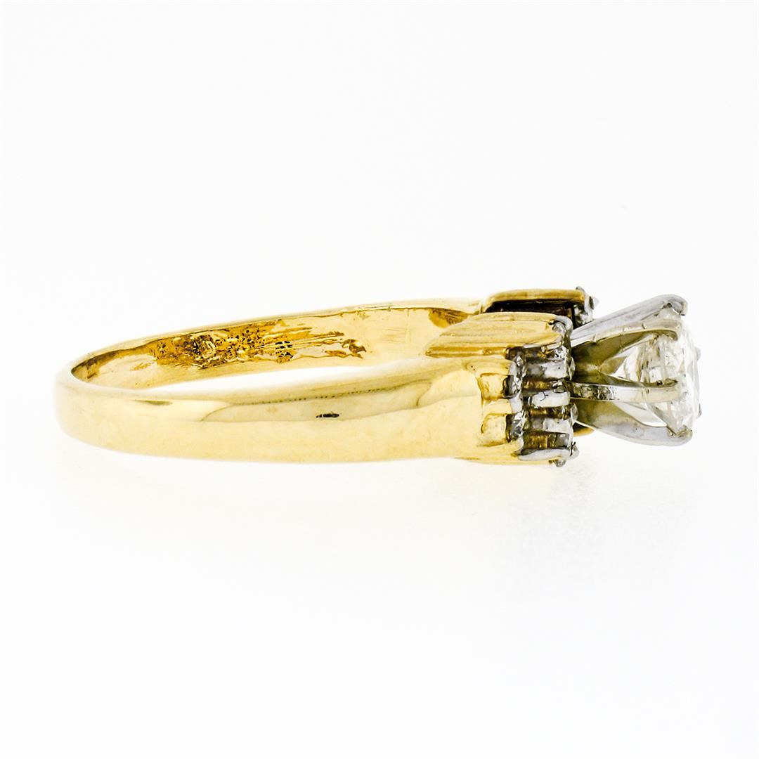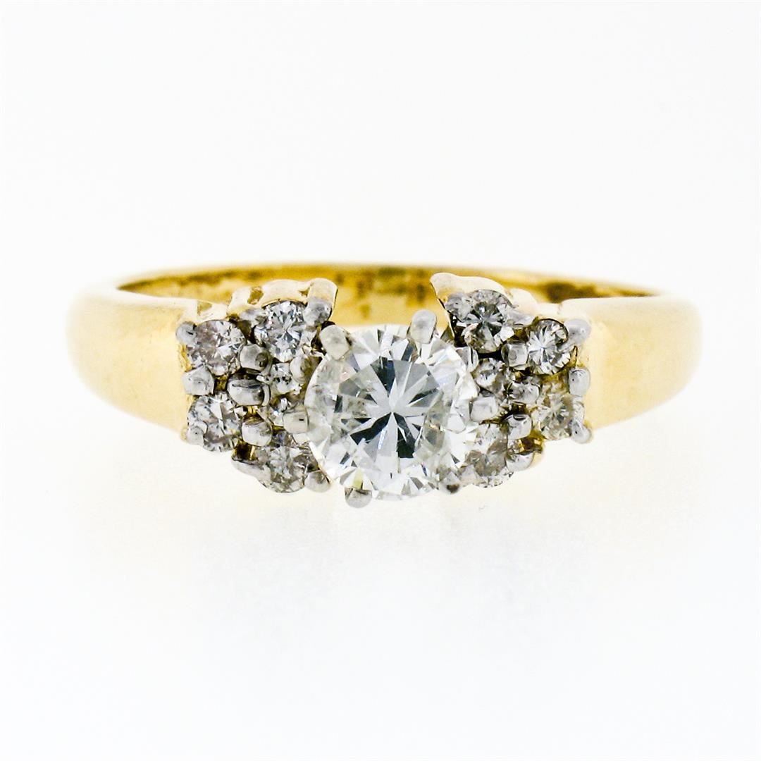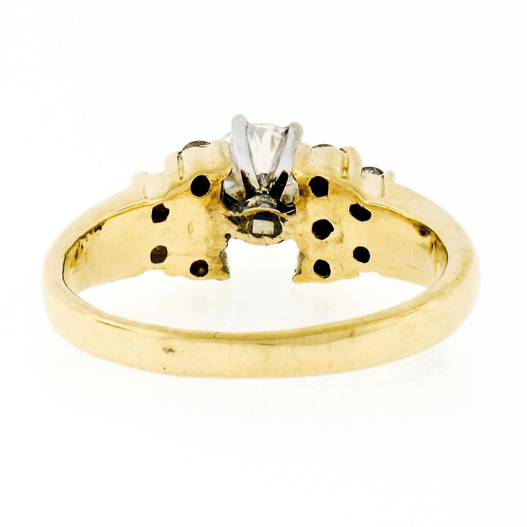 An estate solid 14k yellow and white gold tiered ring, with 1 round brilliant cut natural diamond (G - I1; 0.55ct), and 10 round brilliant cut natural diamonds (G/H- SI1; 0.30ctw). The ring is size 6.0, weighs a total of 4.22 grams, and measures 6.10mm wide.