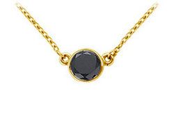 A round black diamond is delicately suspended in a rich 14K yellow gold bezel-setting. This black diamond solitaire pendant has a total weight (TDW) of 1.25 ct and comes with a standard 16 14K gold chain.