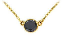 A round black diamond is delicately suspended in a rich 14K yellow gold bezel-setting. This black diamond solitaire pendant has a total weight (TDW) of 1.75 ct and comes with a standard 16 14K gold chain.