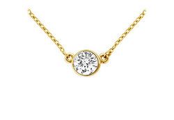 A round diamond is delicately suspended in a rich 14K yellow gold bezel-setting. This diamond solitaire pendant has a total weight (TDW) of 0.33 ct and comes with a standard 16 14K gold chain.