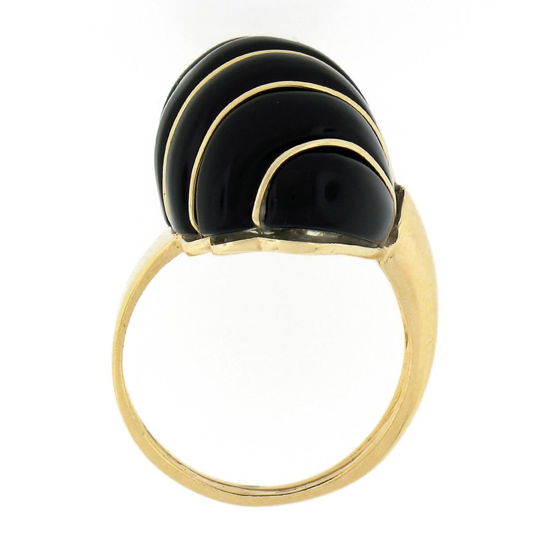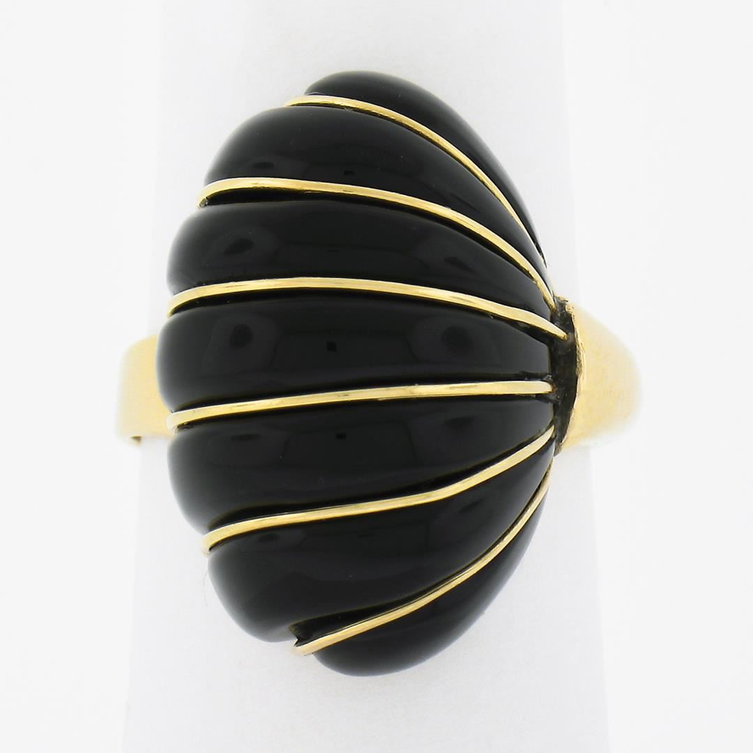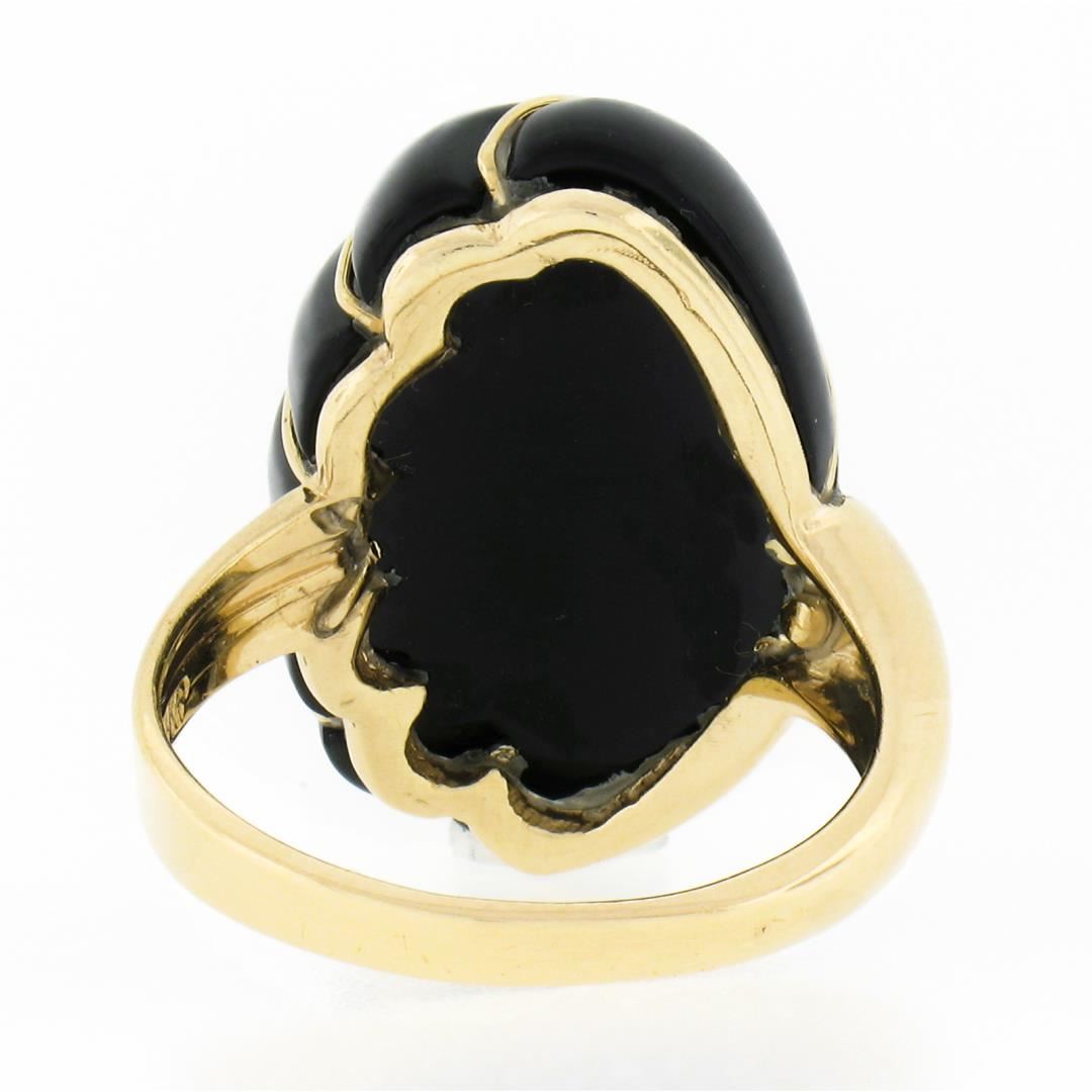 A solid 14k yellow gold scalloped domed ring, with 1 custom cut natural black onyx (20.9x13.4mm). The ring is size 5.5, weighs a total of 6.46 grams, and measures 20.90mm wide.