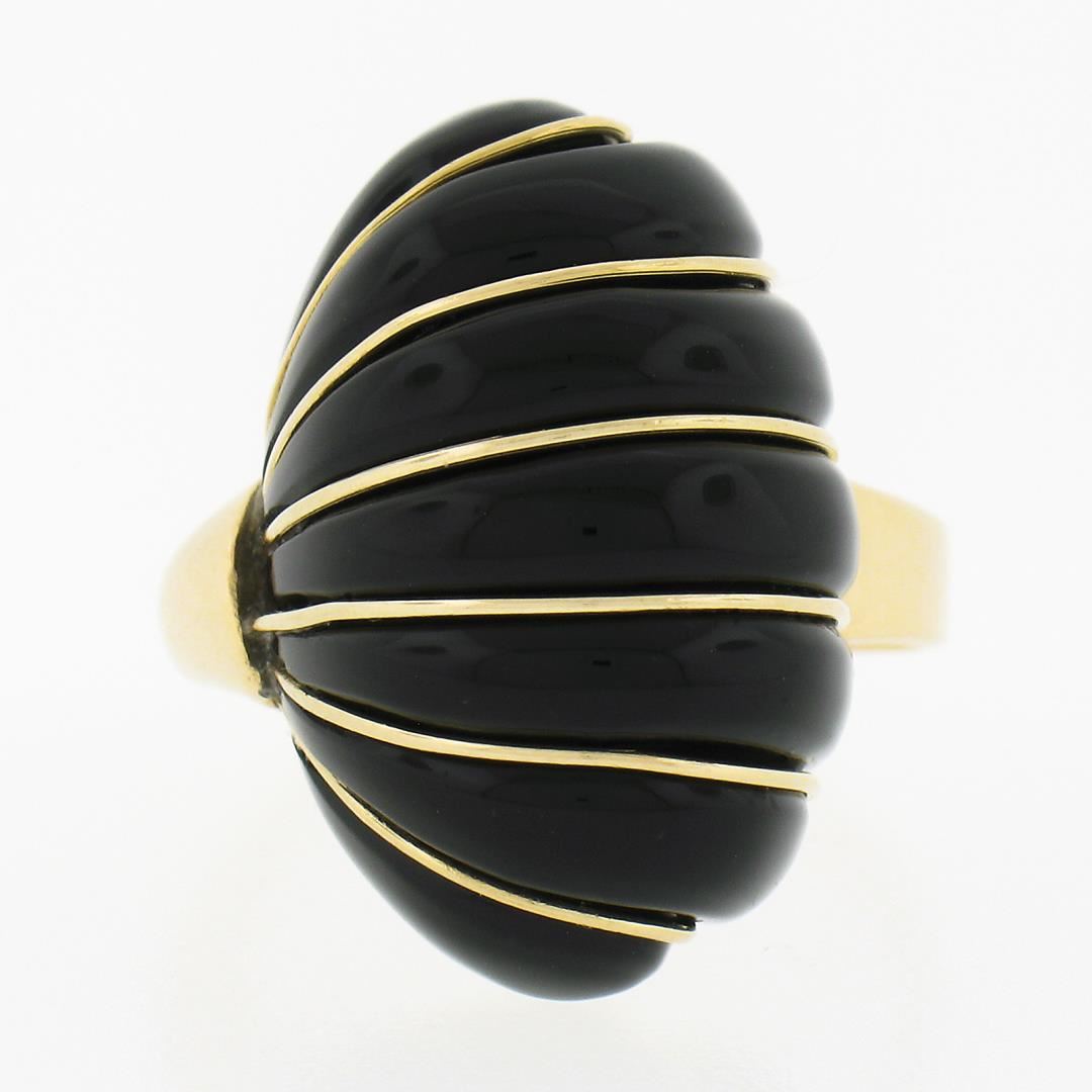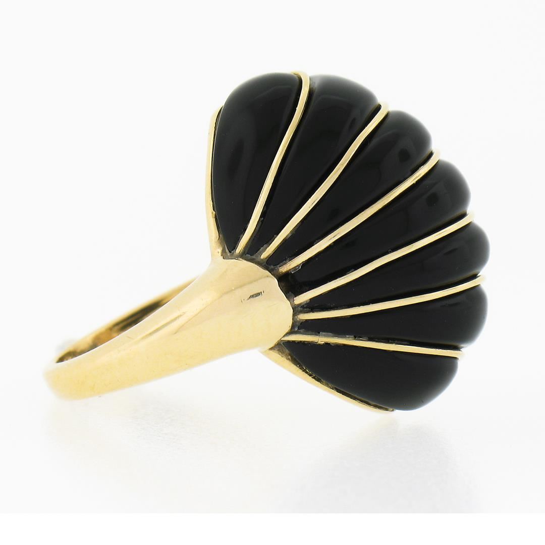 A solid 14k yellow gold scalloped domed ring, with 1 custom cut natural black onyx (20.9x13.4mm). The ring is size 5.5, weighs a total of 6.46 grams, and measures 20.90mm wide.