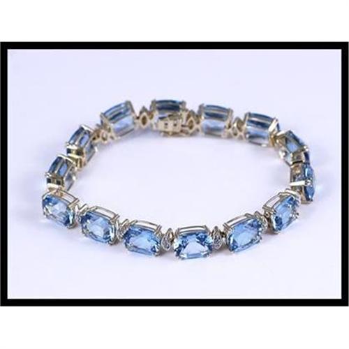Stylish bracelet with 14 cushion shaped blue topazes that measure 10 x 8 millimeters and 28 single cut diamonds that weigh approximately 0.10 carats set in 14K yellow gold. The 7 inch long bracelet measures 7.8 millimeters (0.31 inches) wide and weighs 20.30 grams total weight.