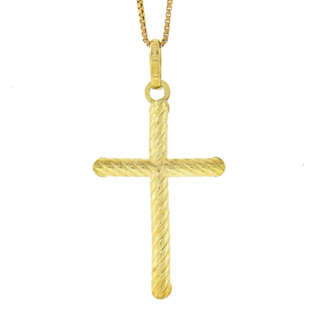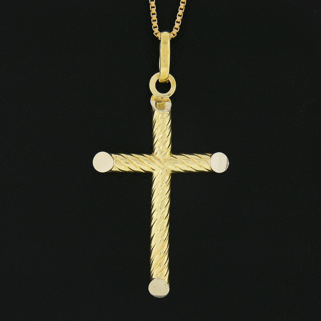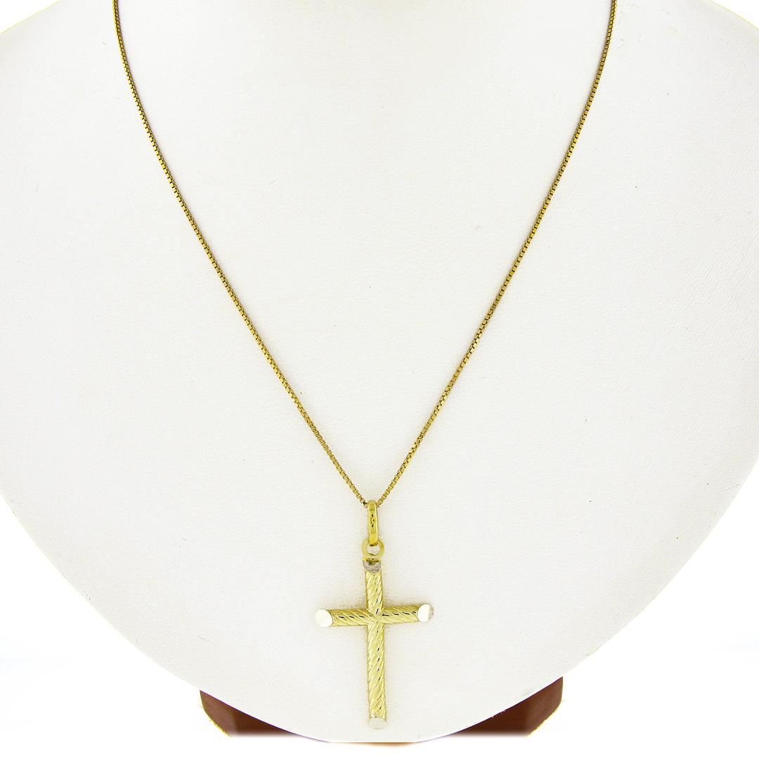 A solid 14k yellow gold cross pendant necklace. 16 inch box link chain, 3.97 grams total weight, pendant measures 38.8x20.1mm.