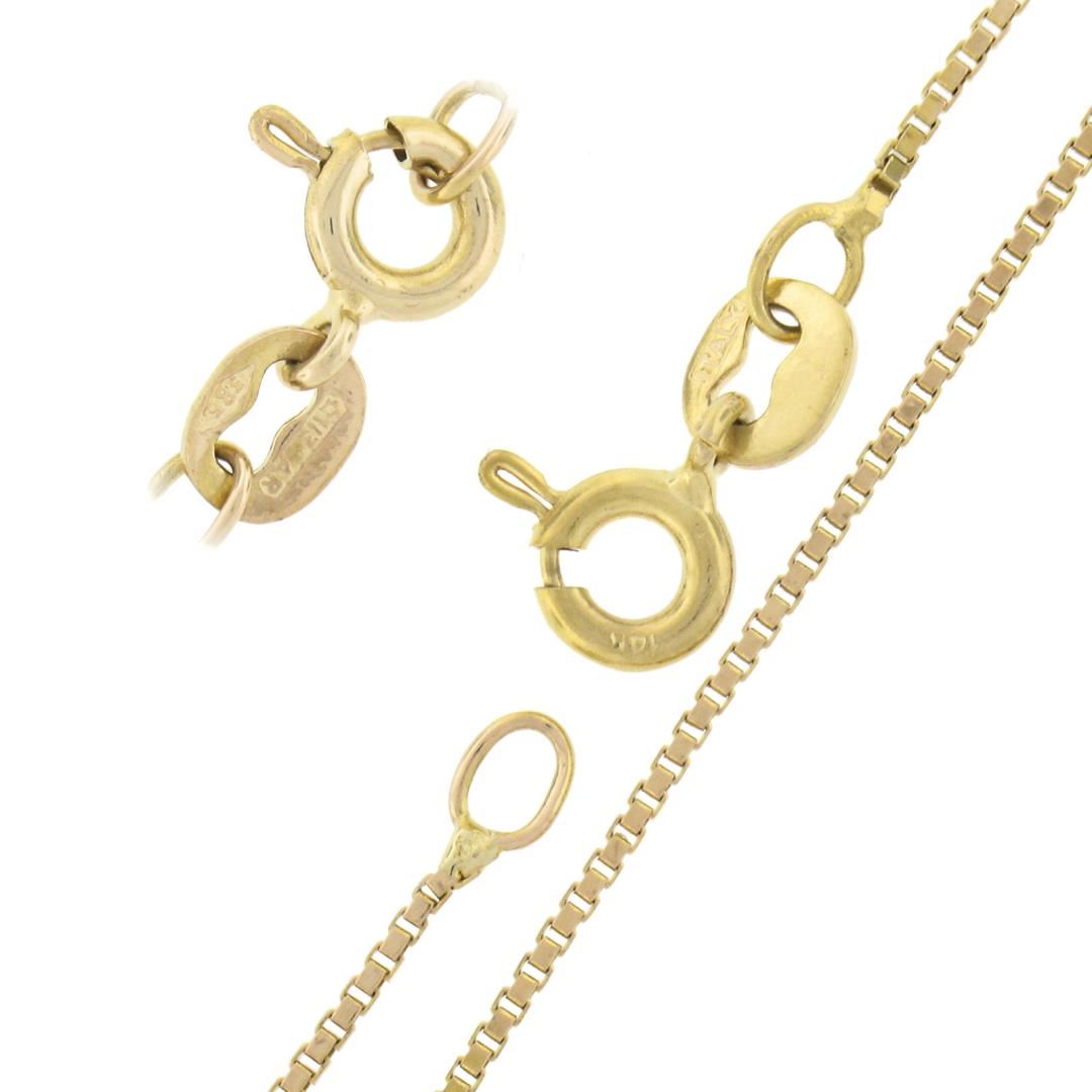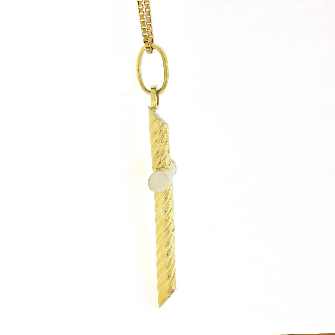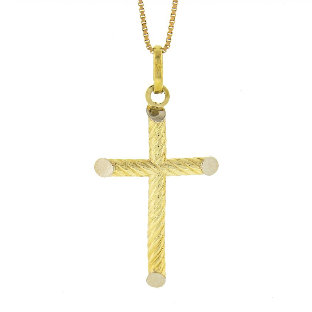 A solid 14k yellow gold cross pendant necklace. 16 inch box link chain, 3.97 grams total weight, pendant measures 38.8x20.1mm.