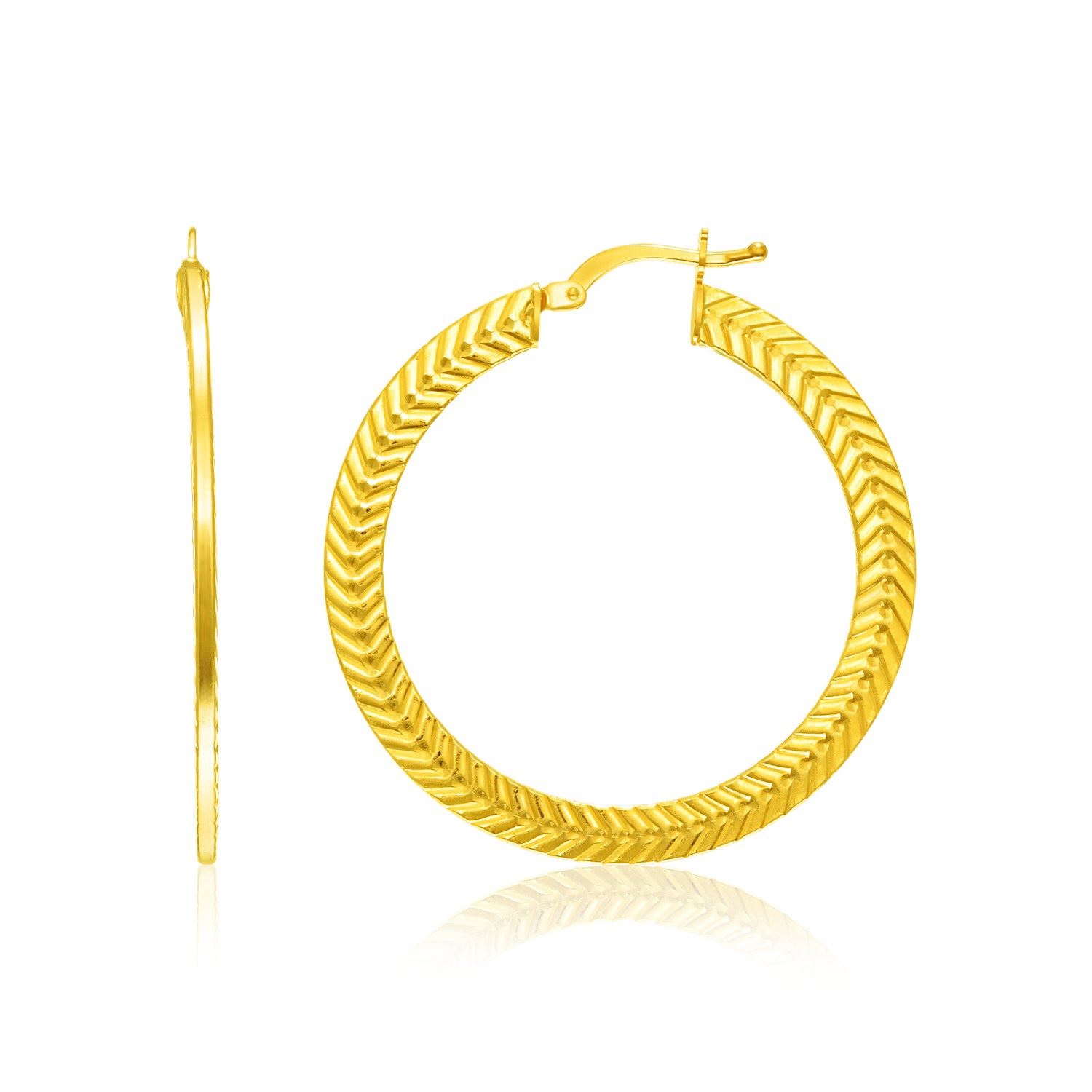 Dainty chevron texture highlights the sides of these thin hoop earrings. Simply lovely in 14K yellow gold these are secured with snap backs.