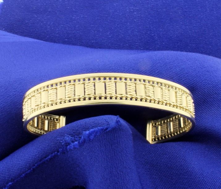 Mesh Design Cuff with 1 3/8 inch opening (flexible) and approx. 2.5 inches in diameter. Design is approx. 7/16 inch wide and is comfortable on wrist. 14g