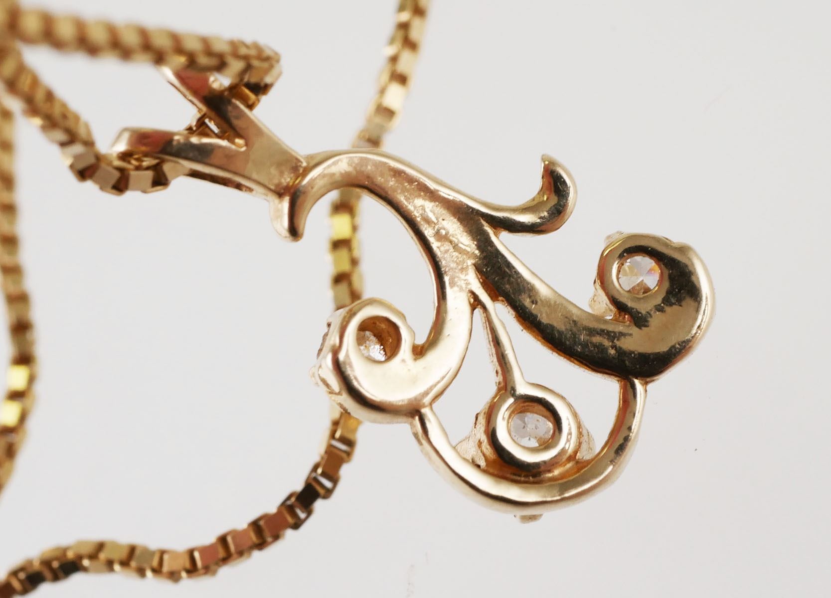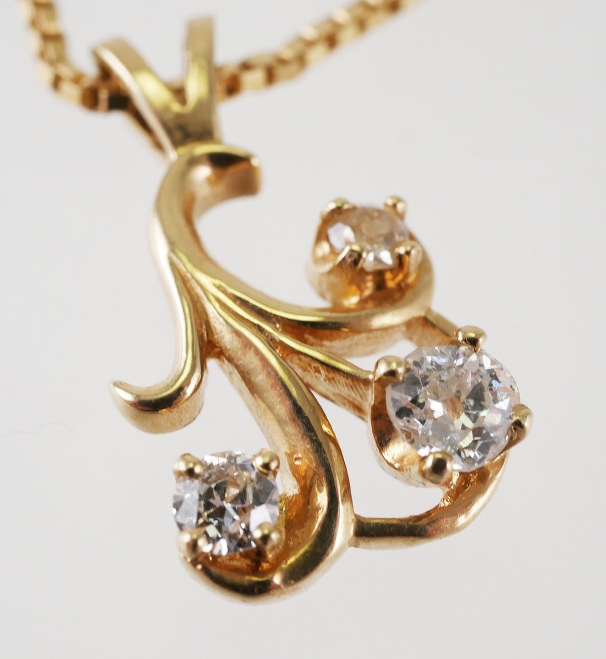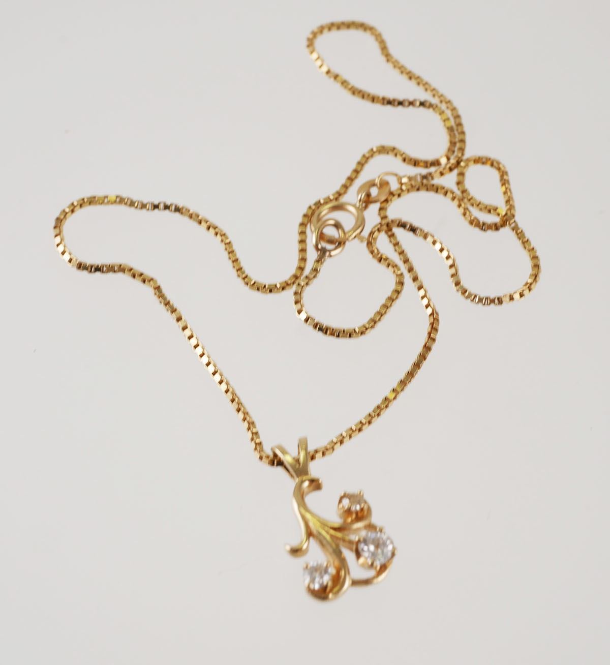 14K yellow gold box link necklace with floral diamond pendant. Round diamonds are approx. .50 total carat weight. Ring clasp marked 14K. Necklace length is 16", overall weight 5.0 grams. Necklace is in good condition with light wear, see photos for more details on condition.