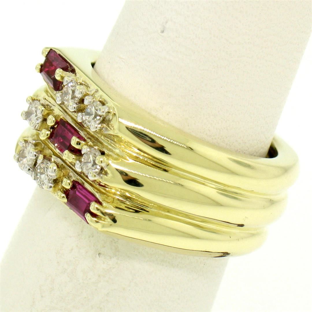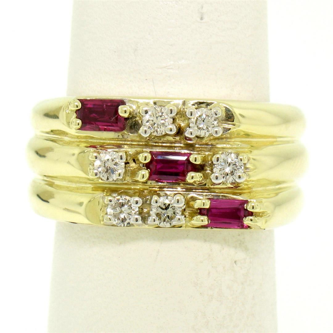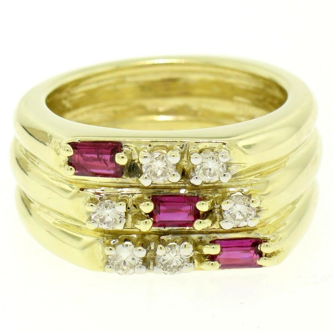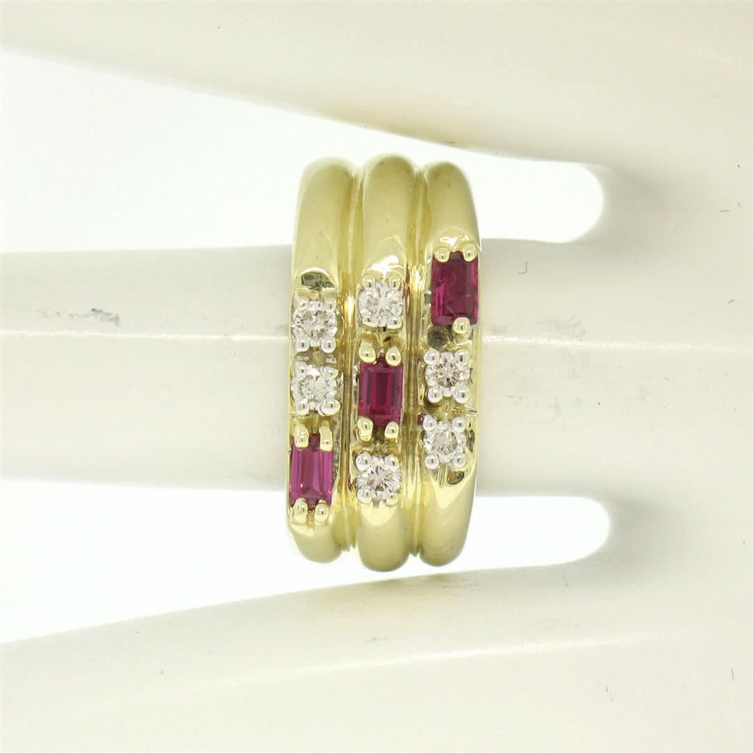 One Unisex 14K Yellow Gold 0.80ctw VS Diamond & Baguette Ruby Wide Grooved Band Ring. Item Details: Material: 14K Solid Yellow Gold, Weight: 14 Grams, Stone(s): (6) Natural Genuine Diamonds - Round Brilliant Cut - Prong Set - G Color - VS1 Clarity - 0.50ctw (approx.), (3) Natural Genuine Rubies - Baguette Cut - Prong Set - Deep Royal Red Color - 0.30ctw (approx.), Total Carat Weight: 0.80 (approx.), Ring Size: 6.5, Ring Width: 10.1mm, Ring Height: 3.5mm rise off the finger. Condition: Like New!