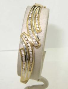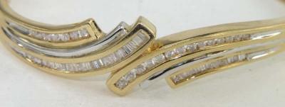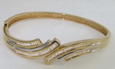 14K Yellow Gold Diamond Bangle. Weight of Bangle: 18.2 grams. Total weight of diamond: 1.23 cts., approximately. I color, SI clarity. The measurements of the Bangle : 52 x 44 mm. The bangle is 9 mm wide and 3 mm in thickness.