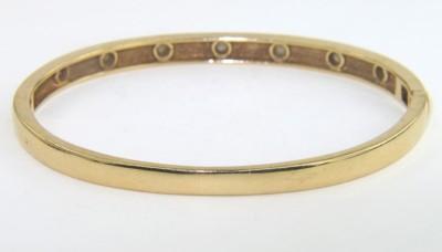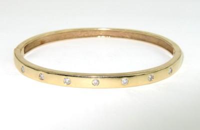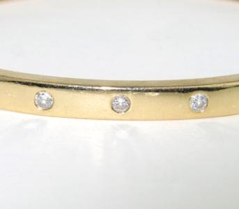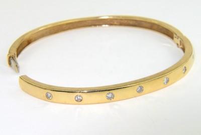 14K Yellow Gold Diamond Bangle. Weight of Bangle: 17.4 grams. Total weight of diamond: 0.2 cts., approximately. H color, VS clarity. The measurements of the Bangle : 59 x 49 mm and 4 mm thick.