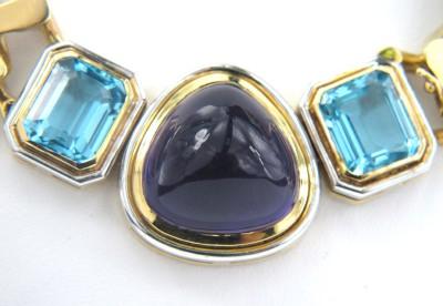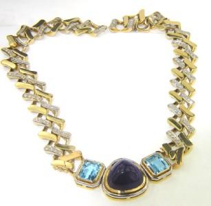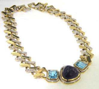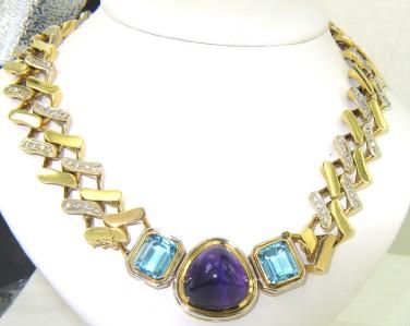 14K Yellow Gold Diamond, Blue Topaz & Cabochon Amethyst Necklace The Necklace weight is 123.6 grams. The total weight of diamond: 4 cts. approximately. H color VS clarity. There are 128 round diamonds on necklace. The measurement of blue topaz: 10 x 11 mm. The measurement of cabochon amethyst: 17 x 17 mm. The size of the pendant is 47 x 24 mm, and 6 mm in thickness. The length of necklace: 14.25". Chain is 16 mm wide and 2 mm in thickness.